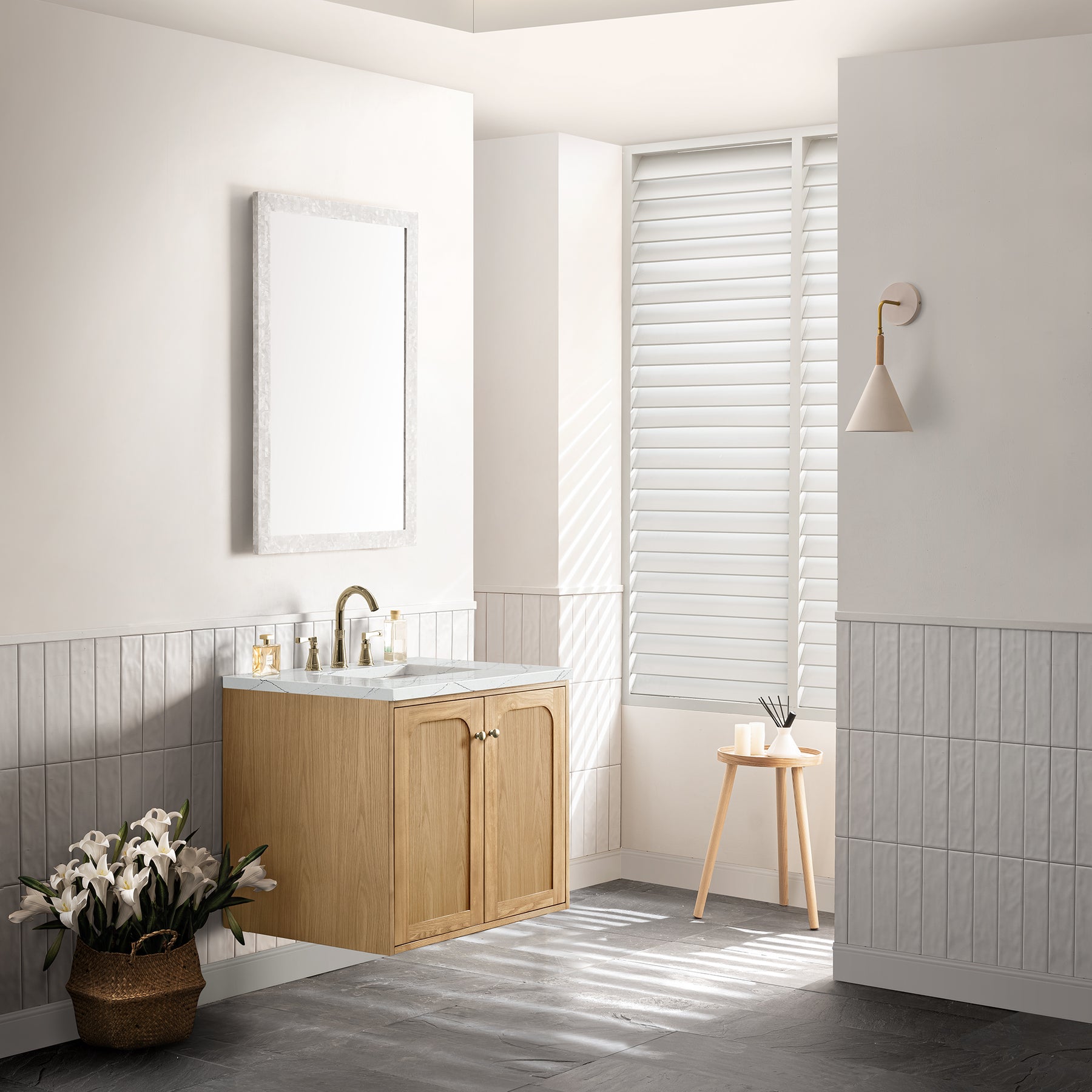 A modern interpretation of mid-century design, the Laurent 30" Single Vanity features organic charm with soft, rounded picture-frame details. Its Light Natural Oak finish over cathedral grain Ash veneers highlights the beautiful, natural wood texture, while Champagne Brass knobs lend a touch of elegance. Designed for versatility, this vanity cabinet features two doors with an adjustable shelf, a conveniently integrated USB/120V power unit, and the option to install as a freestanding or floating vanity. Perfectly crafted and beautifully appointed, Laurent brings an understated elegance to any bathroom. The striking Ethereal Noctis Silestone top completes the look.