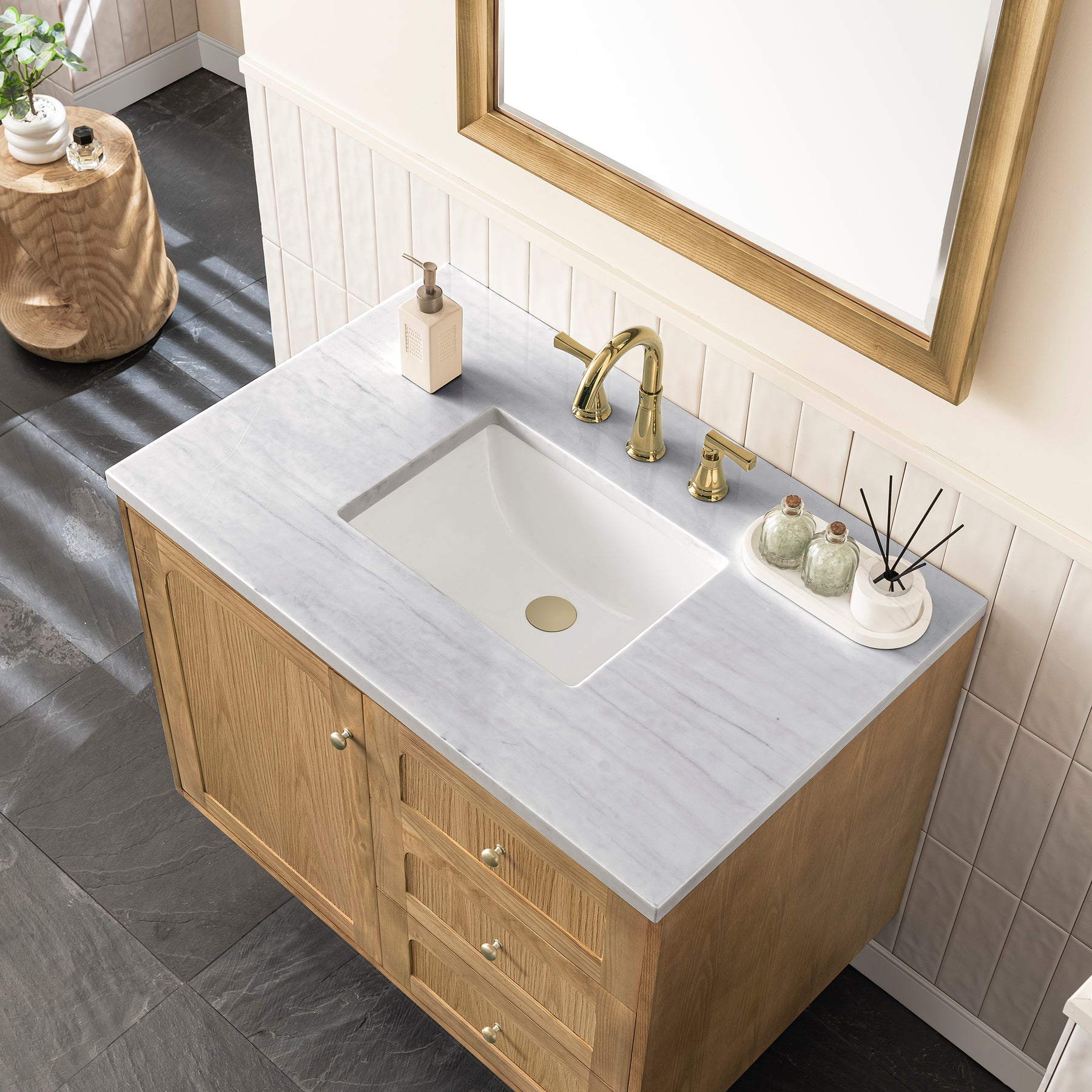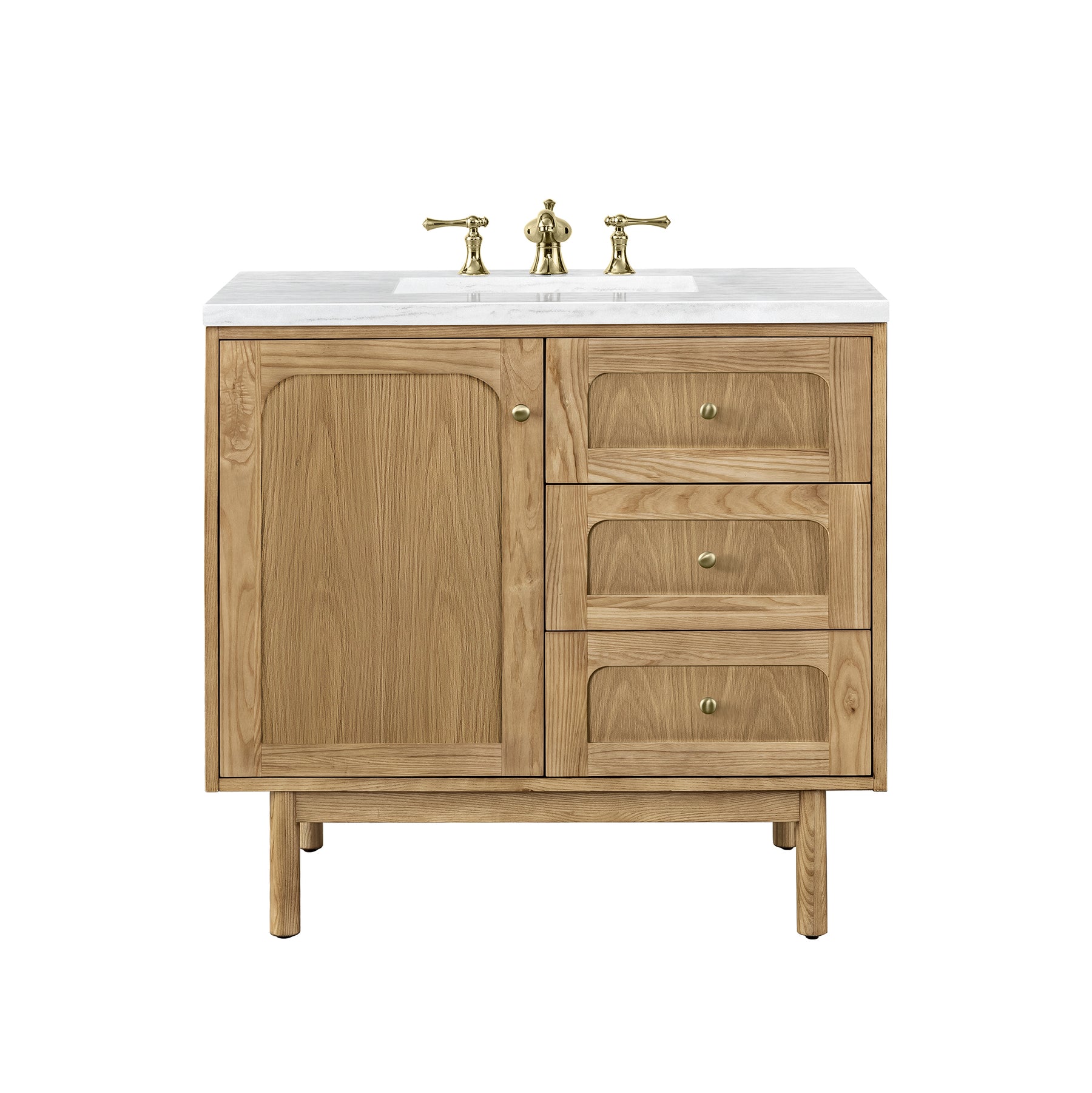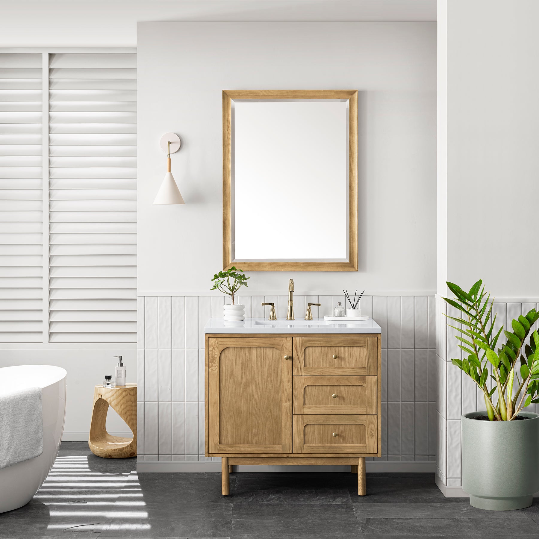 A modern interpretation of mid-century design, the Laurent 36" Single Vanity features organic charm with soft, rounded picture-frame details. Its Light Natural Oak finish over cathedral grain Ash veneers highlights the beautiful, natural wood texture, while Champagne Brass knobs lend a touch of elegance. Designed for versatility, this vanity offers a top-row tip-out drawer and two full-extension drawers with a removable bamboo drawer organizer. The single cabinet door opens to an adjustable shelf and a conveniently integrated USB/120V power unit. Choose to install the Laurent as a freestanding vanity with the modern wood base, or float it on your wall using our durable French cleat hardware. Perfectly crafted and beautifully appointed, Laurent brings an understated elegance to any bathroom. The addition of a modern Arctic Fall Solid Surface top completes the look.