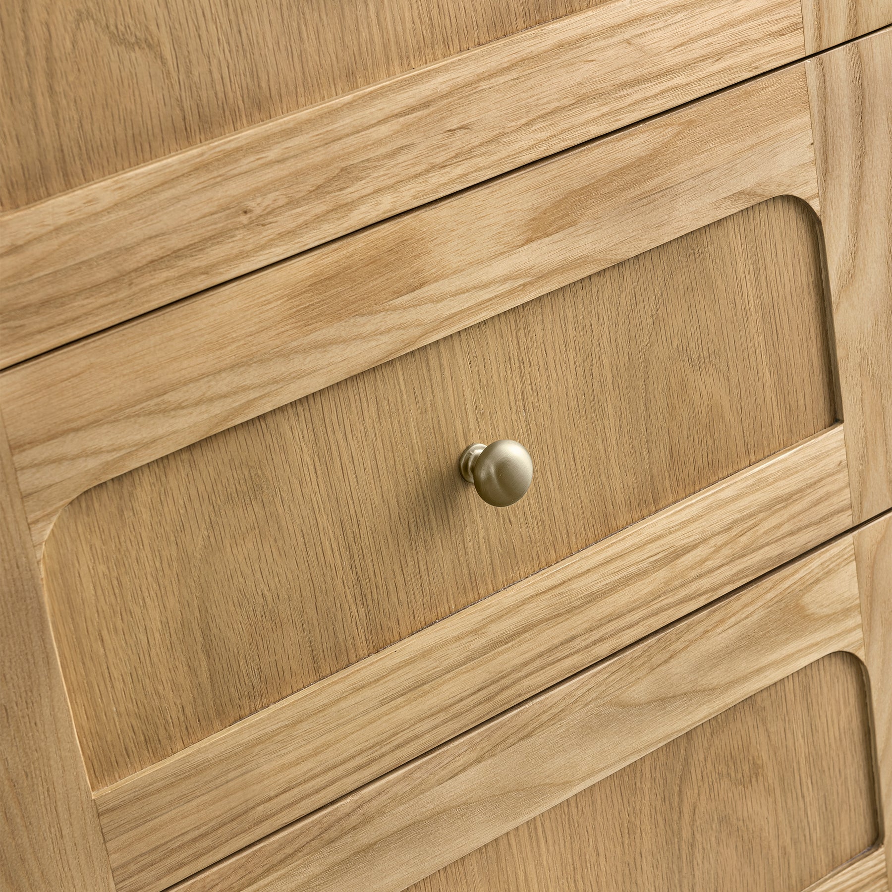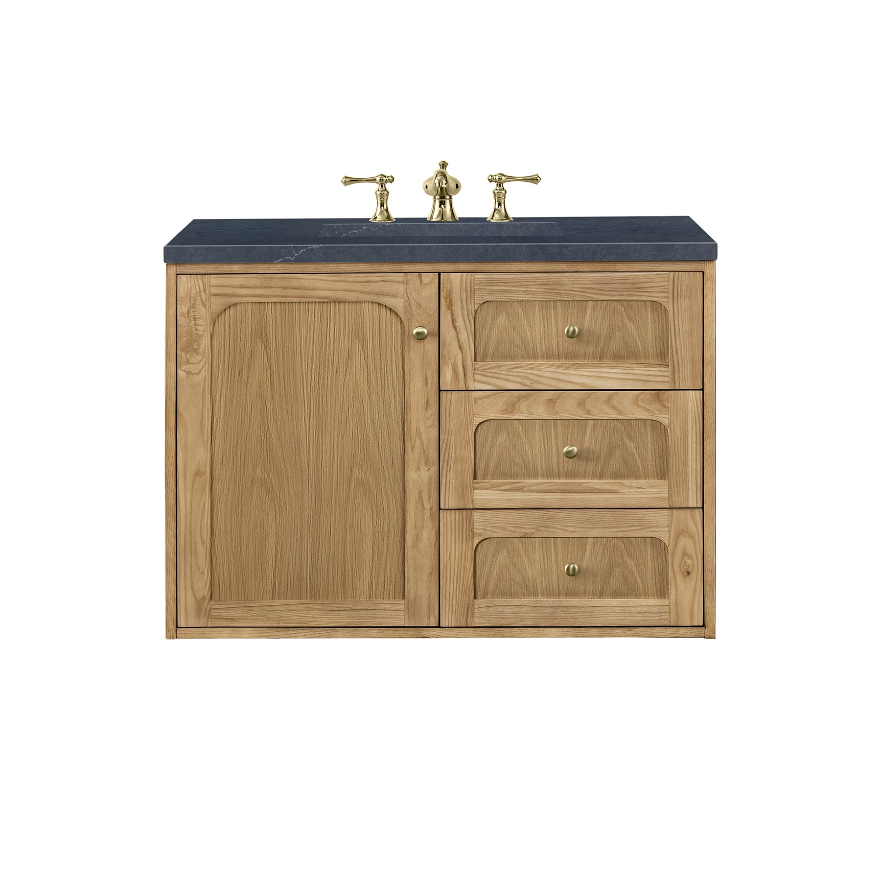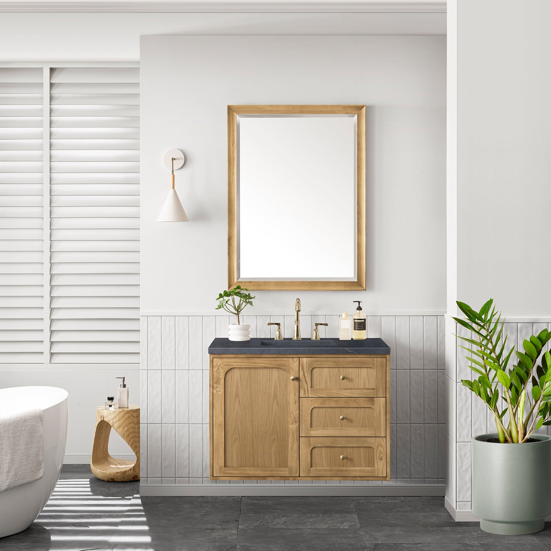 A modern interpretation of mid-century design, the Laurent 36" Single Vanity features organic charm with soft, rounded picture-frame details. Its Light Natural Oak finish over cathedral grain Ash veneers highlights the beautiful, natural wood texture, while Champagne Brass knobs lend a touch of elegance. Designed for versatility, this vanity offers a top-row tip-out drawer and two full-extension drawers with a removable bamboo drawer organizer. The single cabinet door opens to an adjustable shelf and a conveniently integrated USB/120V power unit. Choose to install the Laurent as a freestanding vanity with the modern wood base, or float it on your wall using our durable French cleat hardware. Perfectly crafted and beautifully appointed, Laurent brings an understated elegance to any bathroom. The addition of a matte Charcoal Soapstone Silestone top completes the look.