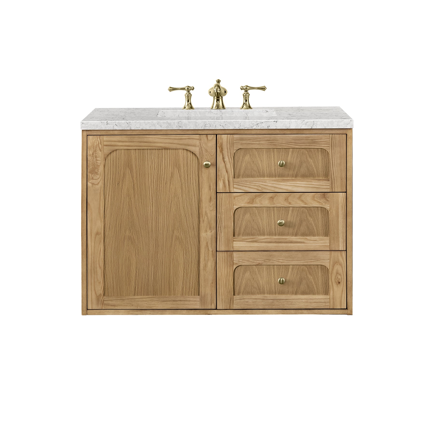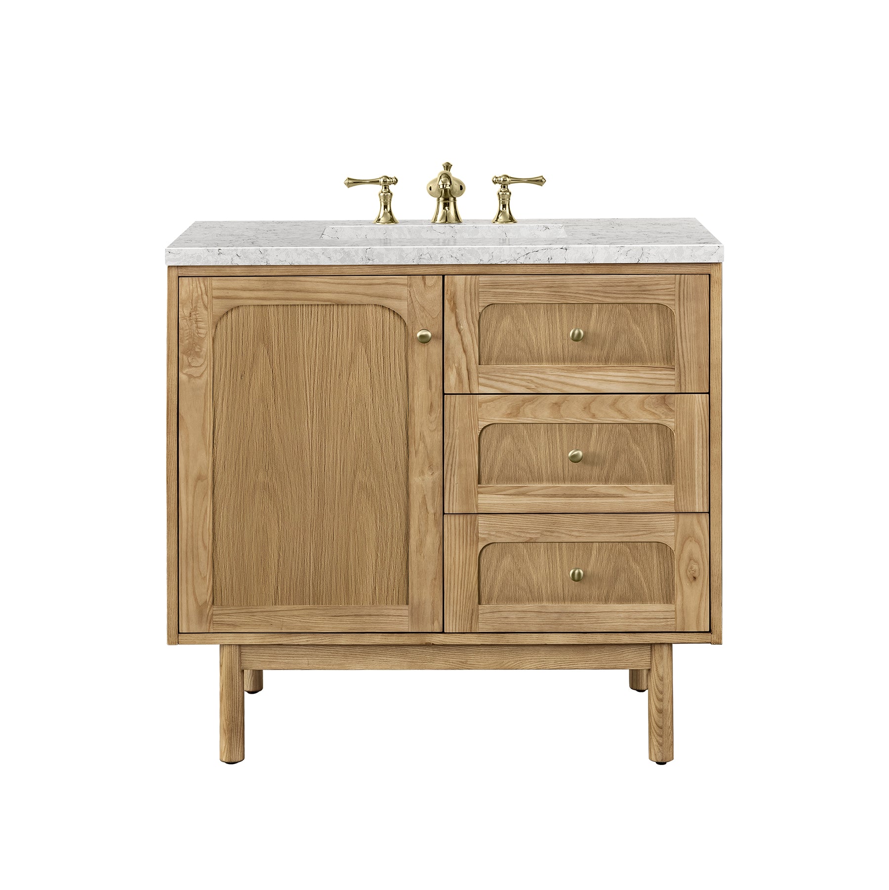 A modern interpretation of mid-century design, the Laurent 36" Single Vanity features organic charm with soft, rounded picture-frame details. Its Light Natural Oak finish over cathedral grain Ash veneers highlights the beautiful, natural wood texture, while Champagne Brass knobs lend a touch of elegance. Designed for versatility, this vanity offers a top-row tip-out drawer and two full-extension drawers with a removable bamboo drawer organizer. The single cabinet door opens to an adjustable shelf and a conveniently integrated USB/120V power unit. Choose to install the Laurent as a freestanding vanity with the modern wood base, or float it on your wall using our durable French cleat hardware. Perfectly crafted and beautifully appointed, Laurent brings an understated elegance to any bathroom. The Eternal Jasmine Pearl Silestone top completes the look.