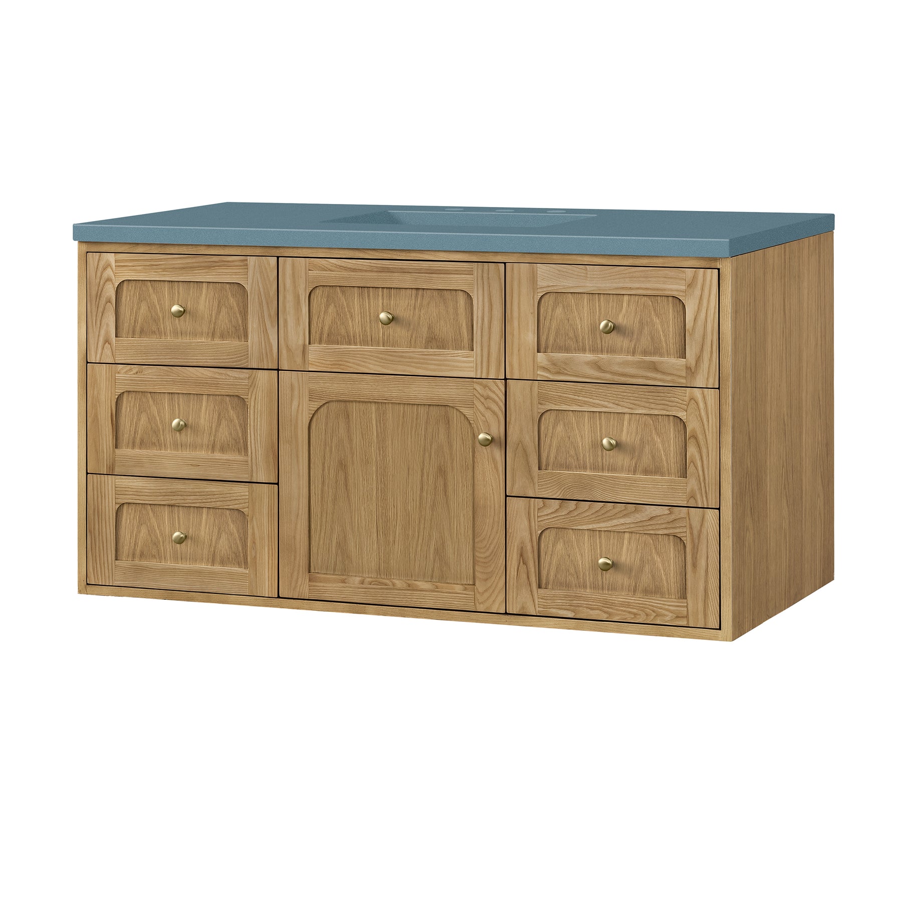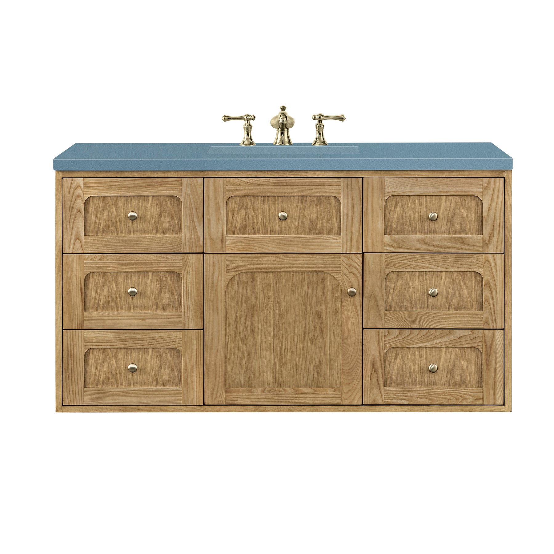 The 48" Laurent Single Vanity features picture frame detailing with unexpected soft curves. The Light Natural Oak finish over cathedral grain ash veneers creates modern rustic appeal. This vanity offers a top-row tip-out style drawer, six traditional drawers, and a removable bamboo storage tray. The single door opens to an adjustable shelf and convenient dual power and USB outlet. Choose to install it as a free-standing vanity with the modern wood base, or choose to float it on your wall using our durable French cleat hardware. The beautiful natural wood texture, elegant detailing, and Champagne Brass knobs create a point of interest in any bathroom space. The 3 CM Cala Blue Silestone top adds the final touch.