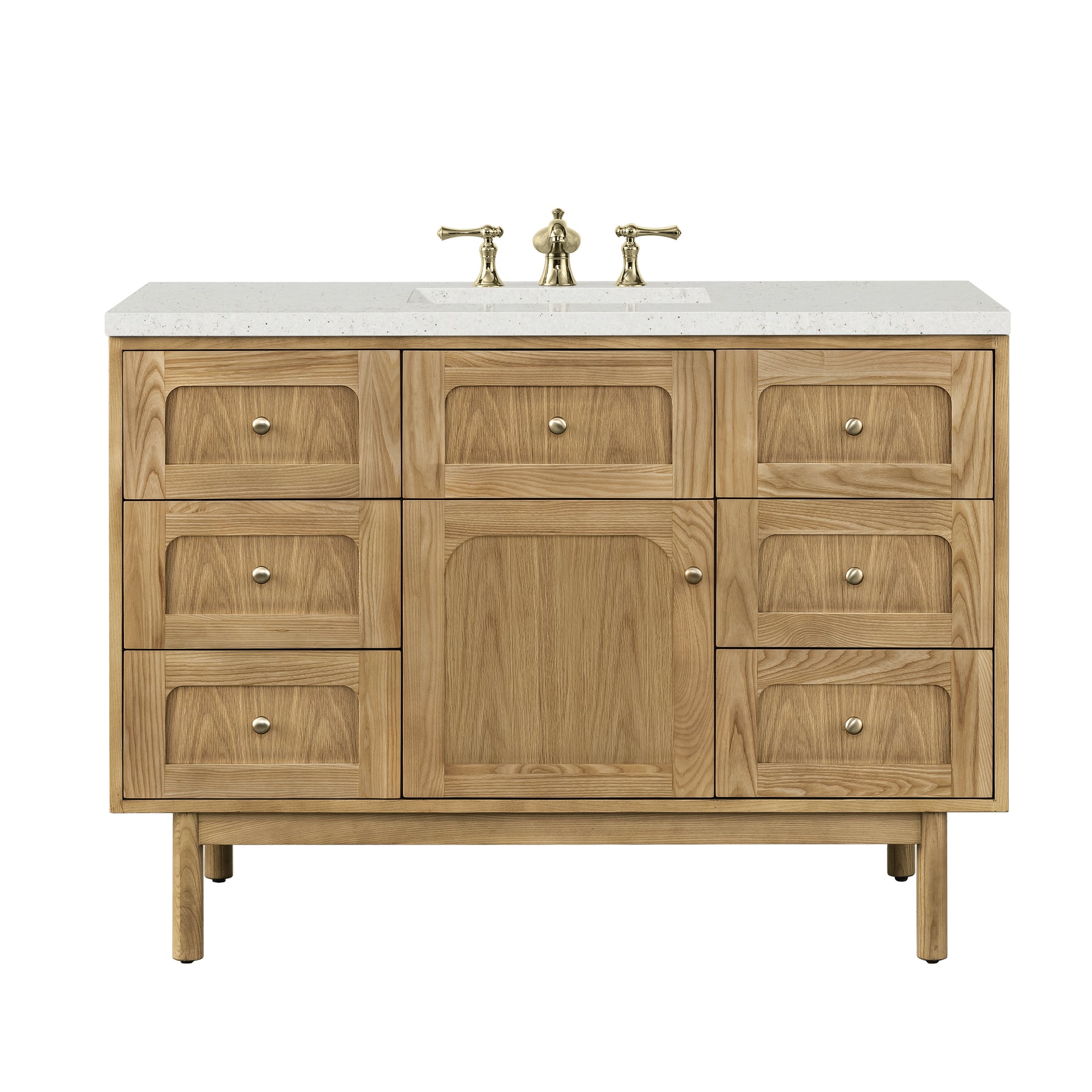A modern interpretation of mid-century design, the Laurent 48" Single Vanity features organic charm with soft, rounded picture-frame details. Its Light Natural Oak finish over cathedral grain Ash veneers highlights the beautiful, natural wood texture, while Champagne Brass knobs lend a touch of elegance. Designed for versatility, this vanity offers a top-row tip-out drawer, six traditional full-extension drawers, and a removable bamboo drawer organizer. The single cabinet door opens to an adjustable shelf and a conveniently integrated USB/120V power unit. Choose to install the Laurent as a freestanding vanity with the modern wood base, or float it on your wall using our durable French cleat hardware. Perfectly crafted and beautifully appointed, Laurent brings an understated elegance to any bathroom. The Lime Delight Silestone top lends warm, textured beige tones to perfectly complement the Light Natural Oak finish of this vanity.