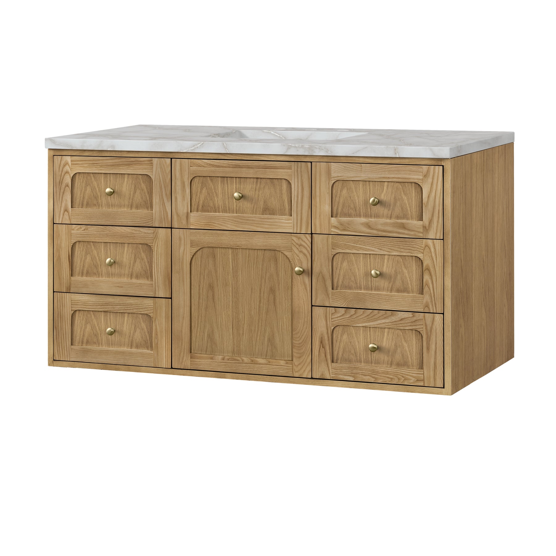 A modern interpretation of mid-century design, the Laurent 48" Single Vanity by James Martin Vanities features organic charm with soft, rounded picture-frame details. Its Light Natural Oak finish over cathedral grain Ash veneers highlights the beautiful, natural wood texture, while Champagne Brass knobs lend a touch of elegance. Designed for versatility, this vanity offers a top-row tip-out drawer, six traditional full-extension drawers, and a removable bamboo drawer organizer. The single cabinet door opens to an adjustable shelf and a conveniently integrated USB/120V power unit. Choose to install the Laurent as a freestanding vanity with the modern wood base, or float it on your wall using our durable French cleat hardware. Perfectly crafted and beautifully appointed, Laurent brings an understated elegance to any bathroom. The light wood finish is enhanced by the neutral background of the Victorian Silver Silestone® top, which boasts beautiful veining and champagne metallic accents which seamlessly complements both warm and cool tones.