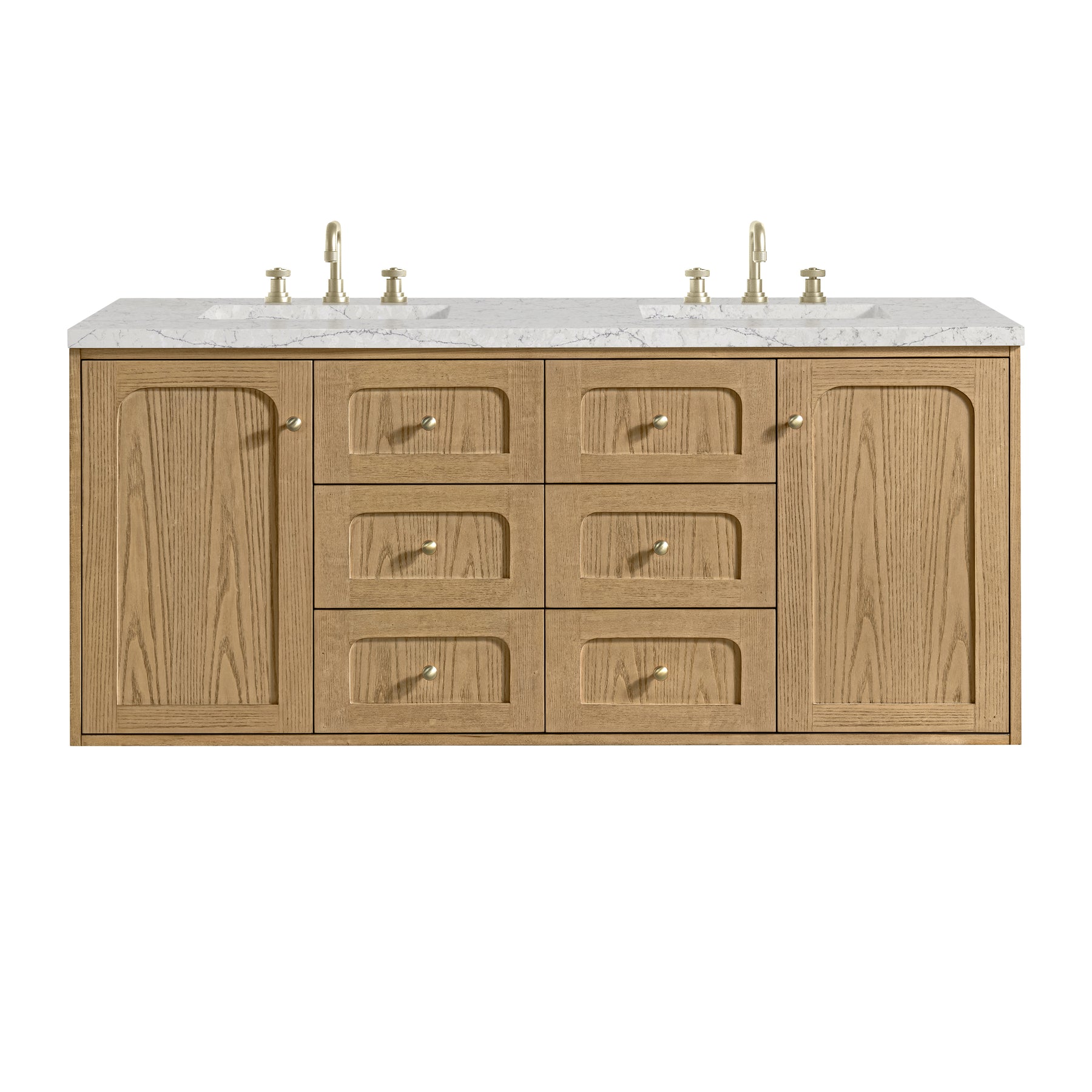 A modern interpretation of mid-century design, the Laurent 60" Double Vanity by James Martin Vanities features organic charm with soft, rounded picture-frame details. Its Light Natural Oak finish over cathedral grain Ash veneers highlights the beautiful, natural wood texture, while Champagne Brass knobs lend a touch of elegance. Designed for versatility, this vanity offers two top-row tip-out drawers, four generously sized full-extension drawers, and a removable bamboo drawer organizer. The two-door cabinet door opens to adjustable shelves and a conveniently integrated USB/120V power unit. Choose to install the Laurent as a freestanding vanity with the modern wood base, or float it on your wall using our durable French cleat hardware. Perfectly crafted and beautifully appointed, Laurent brings an understated elegance to any bathroom. The Eternal Jasmine Pearl Silestone® top completes the look.