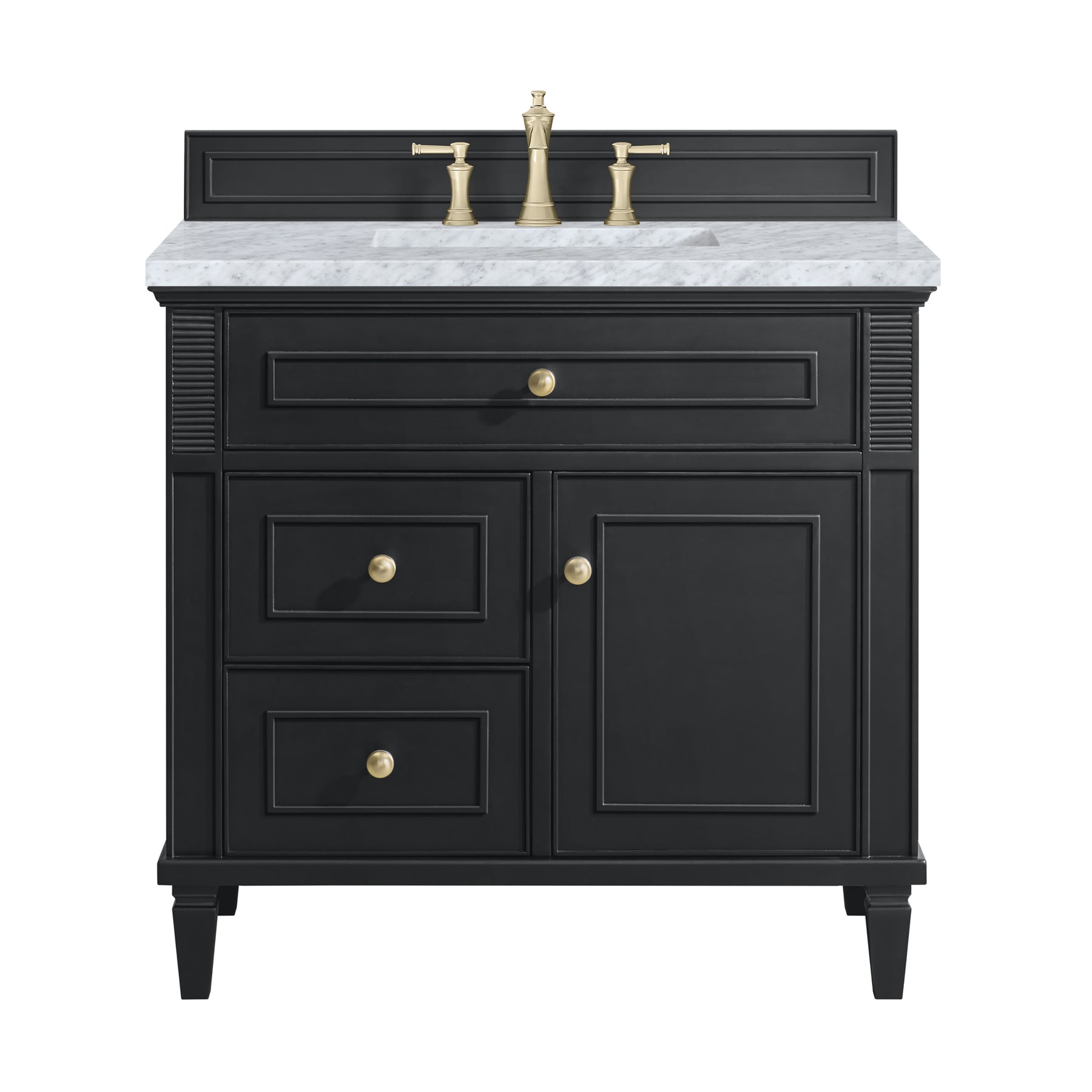 The 36" Lorelai Single Vanity celebrates timeless form and exquisite finish details, combined with practical function. The rich Black Onyx finish is accented by coin-edge knobs in Champagne Brass which provides an sophisticated contrast. Reeded details, and clean, and raised picture frame molding lend visual interest. This single-door cabinet opens to a spacious interior with a single shelf and a convenient USB/Electric power outlet. Two drawers and an upper tip-out drawer offer additional storage space. Completing this vanity, are the treasured, neutral tones and textures of the Carrara marble vanity top display a white background with delicate grey veining.
