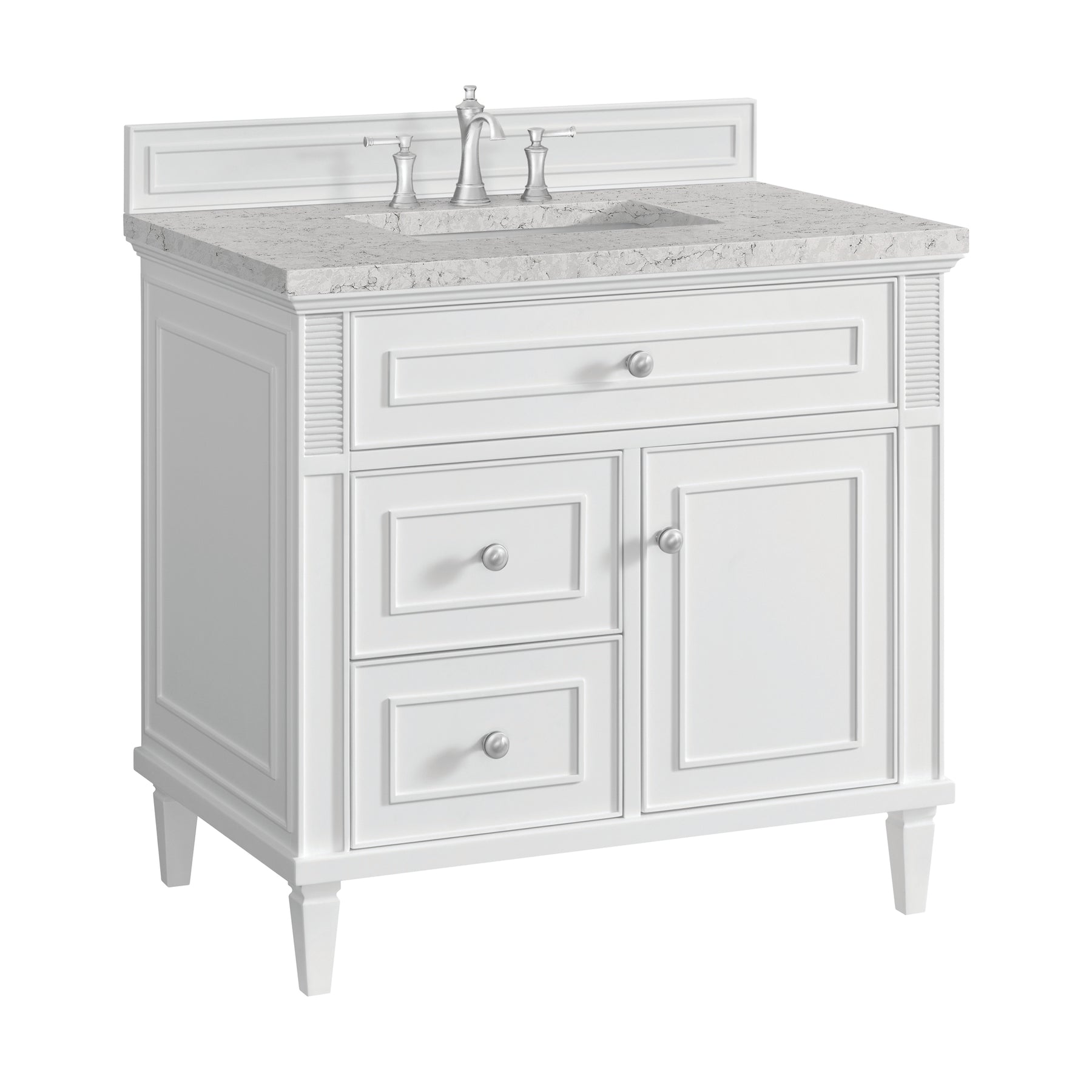 The 36" Lorelai Single Vanity celebrates timeless form and exquisite finish details, combined with practical function. The sophisticated Bright White finish is accented by reeded details, and clean, raised picture frame molding. Coin-edge knobs in Satin Nickel provide the perfect accent. This single-door cabinet opens to a spacious interior with a single shelf and a convenient USB/Electric power outlet. Two drawers and an upper tip-out drawer offer additional storage space. Completing the look is the Eternal Jasmine Pearl Silestone top by Cosentino, featuring an elegant white background with subtle marbleized swirls and dark Bleu-gray veining patterns.