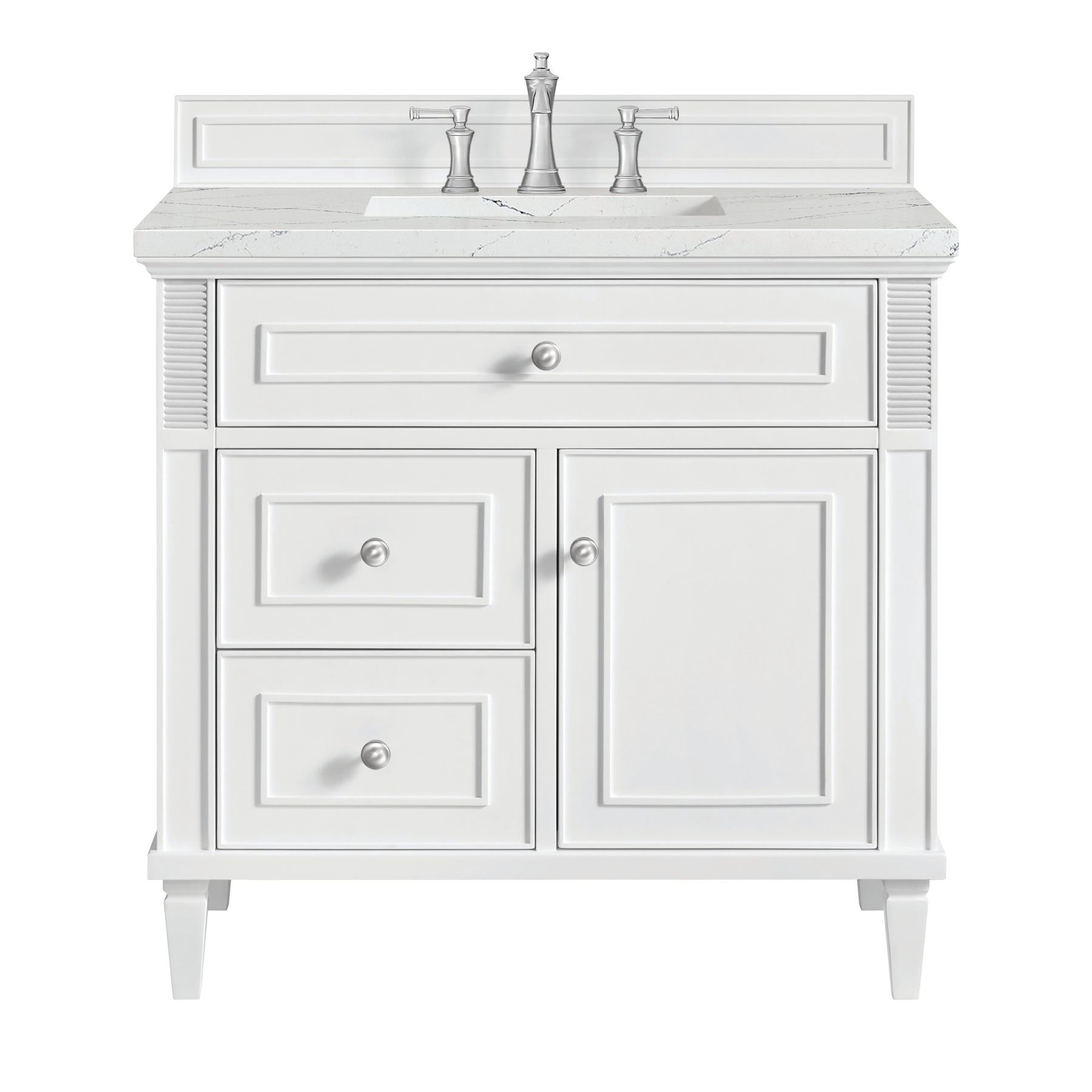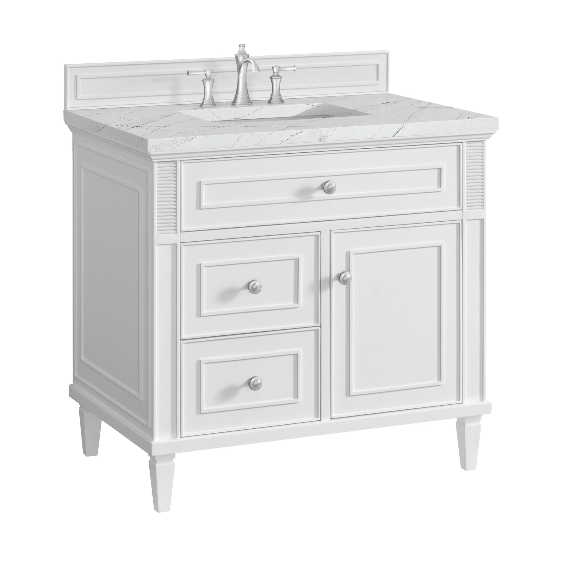 The 36" Lorelai Single Vanity celebrates timeless form and exquisite finish details, combined with practical function. The sophisticated Bright White finish is accented by reeded details, and clean, raised picture frame molding. Coin-edge knobs in Satin Nickel provide the perfect accent. This single-door cabinet opens to a spacious interior with a single shelf and a convenient USB/Electric power outlet. Two drawers and an upper tip-out drawer offer additional storage space. The addition of a Ethereal Noctis Silestone top by Cosentino with undermount rectangular sink completes this timeless bathroom centerpiece with its modern, intricate black and gray nuances which add contrast and elegance to the white background.