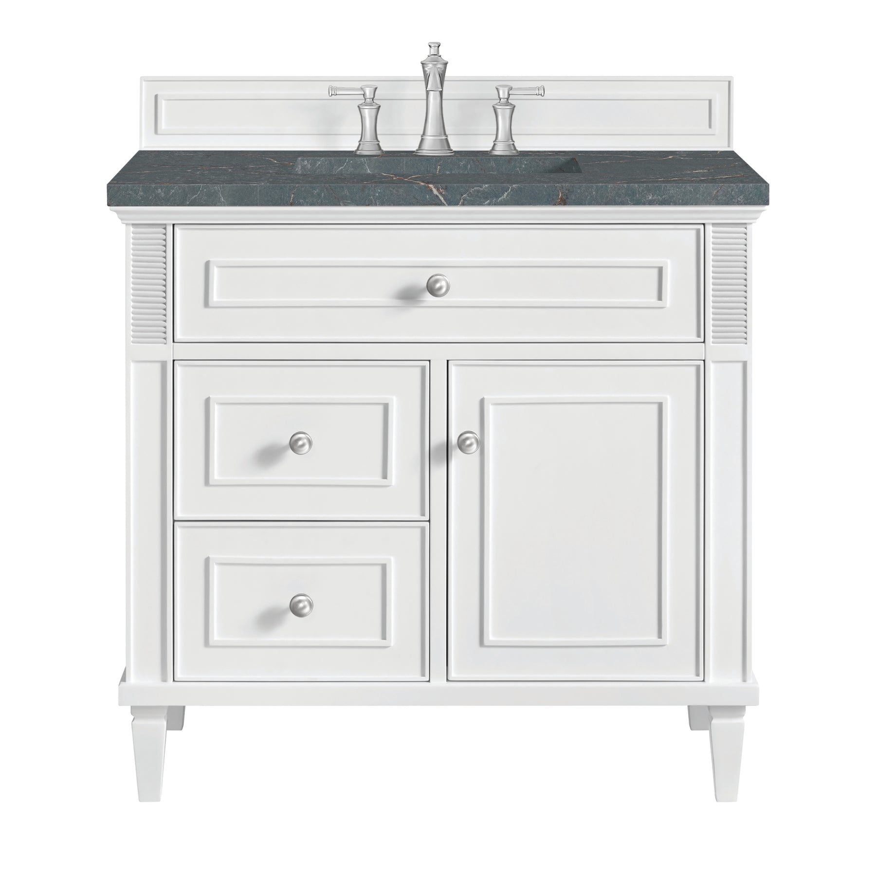 The 36" Lorelai Single Vanity celebrates timeless form and exquisite finish details, combined with practical function. The sophisticated Bright White finish is accented by reeded details, and clean, raised picture frame molding. Coin-edge knobs in Satin Nickel provide the perfect accent. This single-door cabinet opens to a spacious interior with a single shelf and a convenient USB/Electric power outlet. Two drawers and an upper tip-out drawer offer additional storage space. The finish and hardware accents are enhanced by the Parisien Blue Silestone top, offering a deep bluish hue with broad and intricate neutral veins highlighted by fine coppery accents.