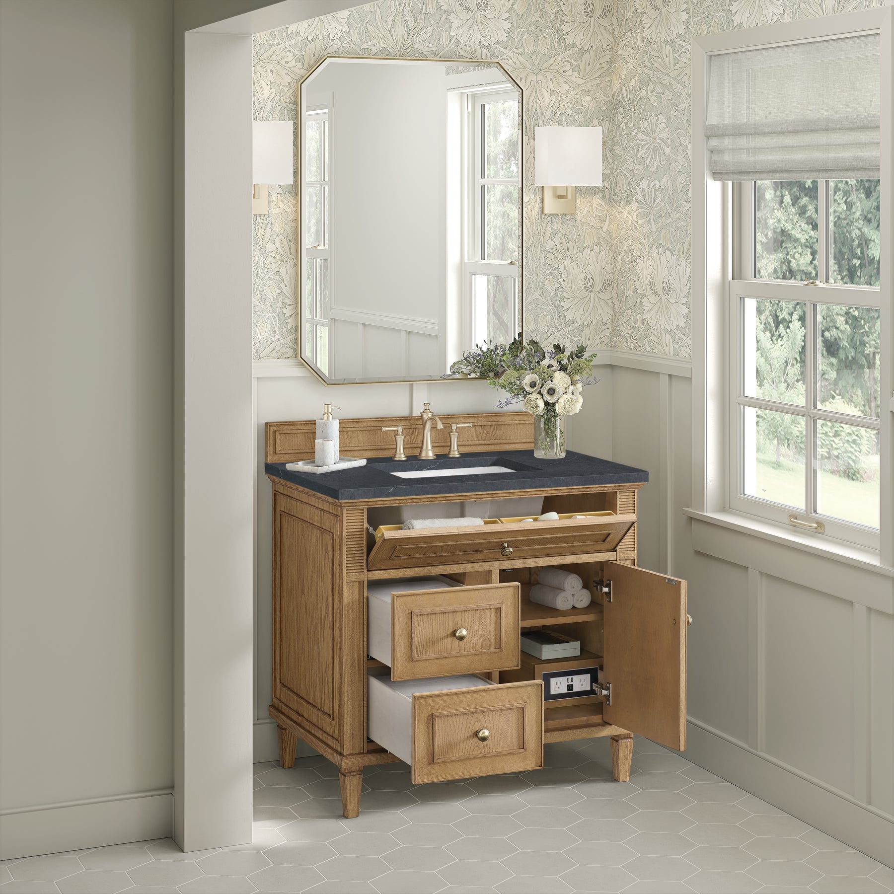 The 36" Lorelai Single Vanity celebrates timeless form and exquisite finish details, combined with practical function. The Light Natural Oak finish is accented by reeded details, and clean, raised picture frame molding. Coin-edge knobs in Champagne Brass provide the perfect accent. This single-door cabinet opens to a spacious interior with a single shelf and a convenient USB/Electric power outlet. Two drawers and an upper tip-out drawer offer additional storage space. Completing this piece is a distinguished top, characterized by depth and a sense of movement with a suede finish. The Charcoal Soapstone Silestone top is a timeless statement to complete the look of your vanity.