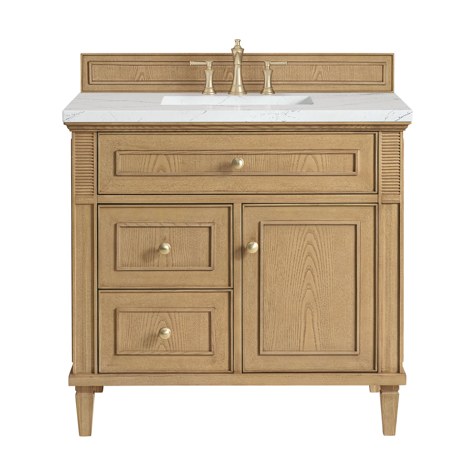 The 36" Lorelai Single Vanity celebrates timeless form and exquisite finish details, combined with practical function. The Light Natural Oak finish is accented by reeded details, and clean, raised picture frame molding. Coin-edge knobs in Champagne Brass provide the perfect accent. This single-door cabinet opens to a spacious interior with a single shelf and a convenient USB/Electric power outlet. Two drawers and an upper tip-out drawer offer additional storage space. The addition of a Ethereal Noctis Silestone top by Cosentino with undermount rectangular sink completes this timeless bathroom centerpiece with its modern, intricate black and gray nuances which add contrast and elegance to the white background.
