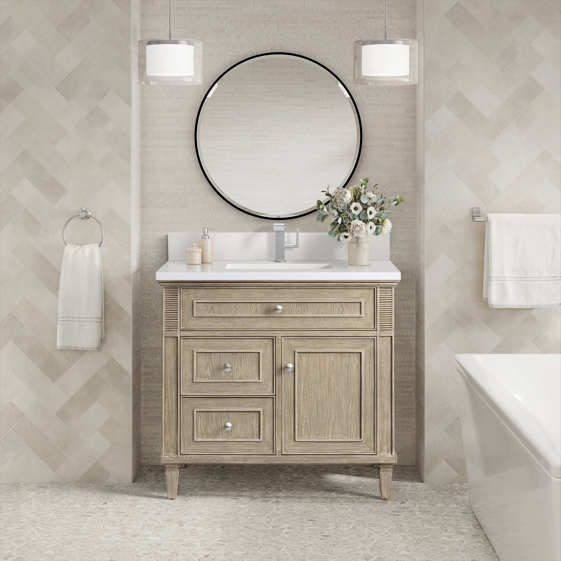 The 36" Lorelai Single Vanity celebrates timeless form and exquisite finish details, combined with practical function. The Whitewashed Oak finish is accented by reeded details, and clean, raised picture frame molding. Coin-edge knobs in Satin Nickel provide the perfect accent. This single-door cabinet opens to a spacious interior with a single shelf and a convenient USB/Electric power outlet. Two drawers and an upper tip-out drawer offer additional storage space. With the addition of a classic White Zeus Silestone top with backsplash and undermount sink, this vanity is a seamless integration of modern design and functionality.
