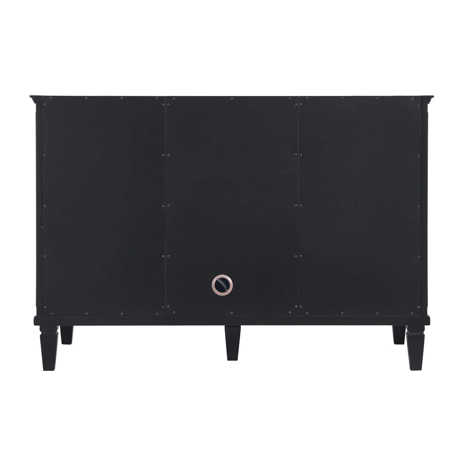 The 48" Lorelai Single Vanity celebrates timeless form and exquisite finish details, combined with practical function. The rich Black Onyx finish is accented by coin-edge knobs in Champagne Brass which provides an sophisticated contrast. Reeded details, and clean, and raised picture frame molding lend visual interest. This single-door cabinet opens to a spacious interior with a single shelf and a convenient USB/Electric power outlet. Six drawers plus one tip-out drawer offer additional storage space. The Lime Delight Silestone top lends warm, textured beige tones to perfectly complement the dark finish on the vanity.