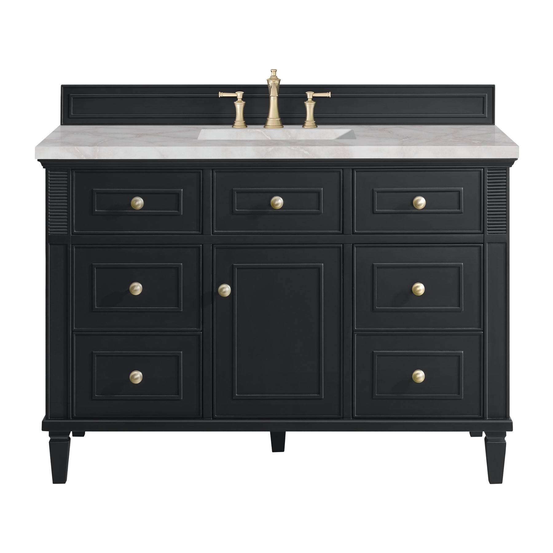 The Lorelai 48" Single Vanity by James Martin Vanities celebrates timeless design and exquisite finish details, combined with practical function. The rich Black Onyx finish is accented by coin-edge knobs in Champagne Brass which provides a sophisticated contrast. Reeded details and raised picture frame molding lend visual interest. This single-door cabinet opens to a spacious interior with a single shelf and a convenient USB/120V power outlet. Six standard full-extension drawers and one top-row tip-out drawer offer additional storage. The addition of a stunning Victorian Silver Silestone top with undermount sink completes the look.