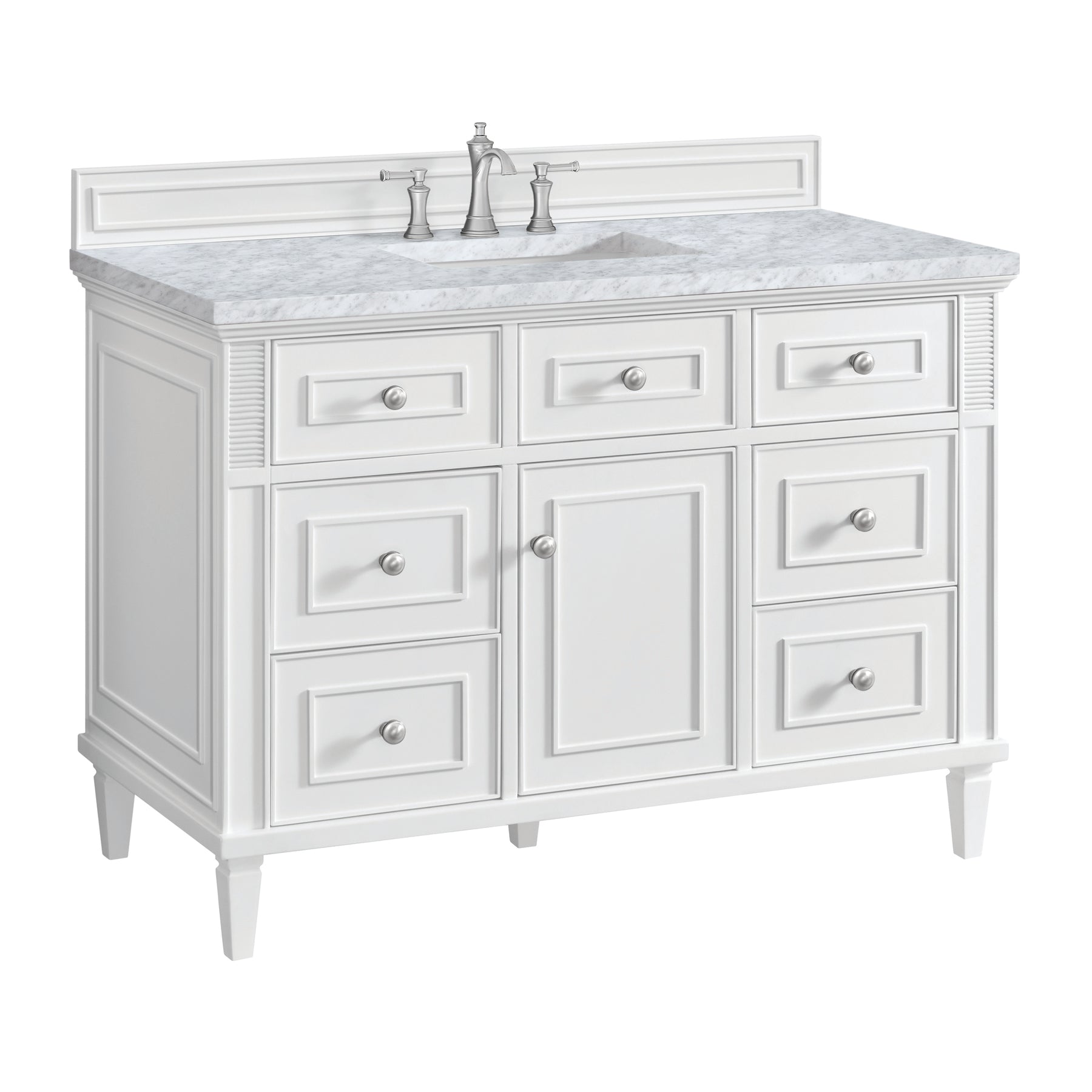 The 48" Lorelai Single Vanity celebrates timeless form and exquisite finish details, combined with practical function. The sophisticated Bright White finish is accented by reeded details, and clean, raised picture frame molding. Coin-edge knobs in Satin Nickel provide the perfect accent. This single-door cabinet opens to a spacious interior with a single shelf and a convenient USB/Electric power outlet. Six drawers plus one tip-out drawer offer additional storage space. Completing this vanity, are the treasured, neutral tones and textures of the Carrara marble vanity top display a white background with delicate grey veining.