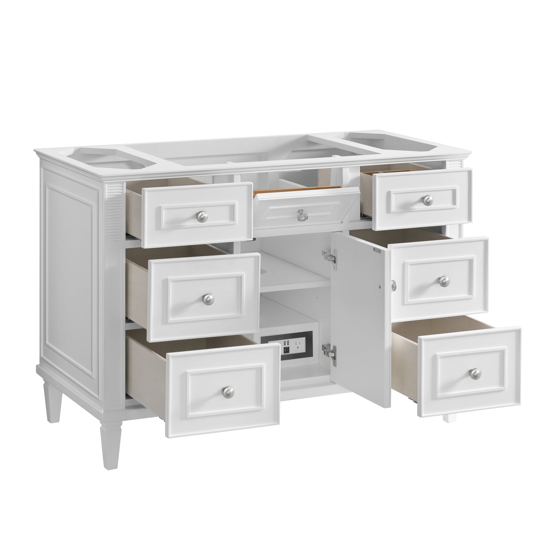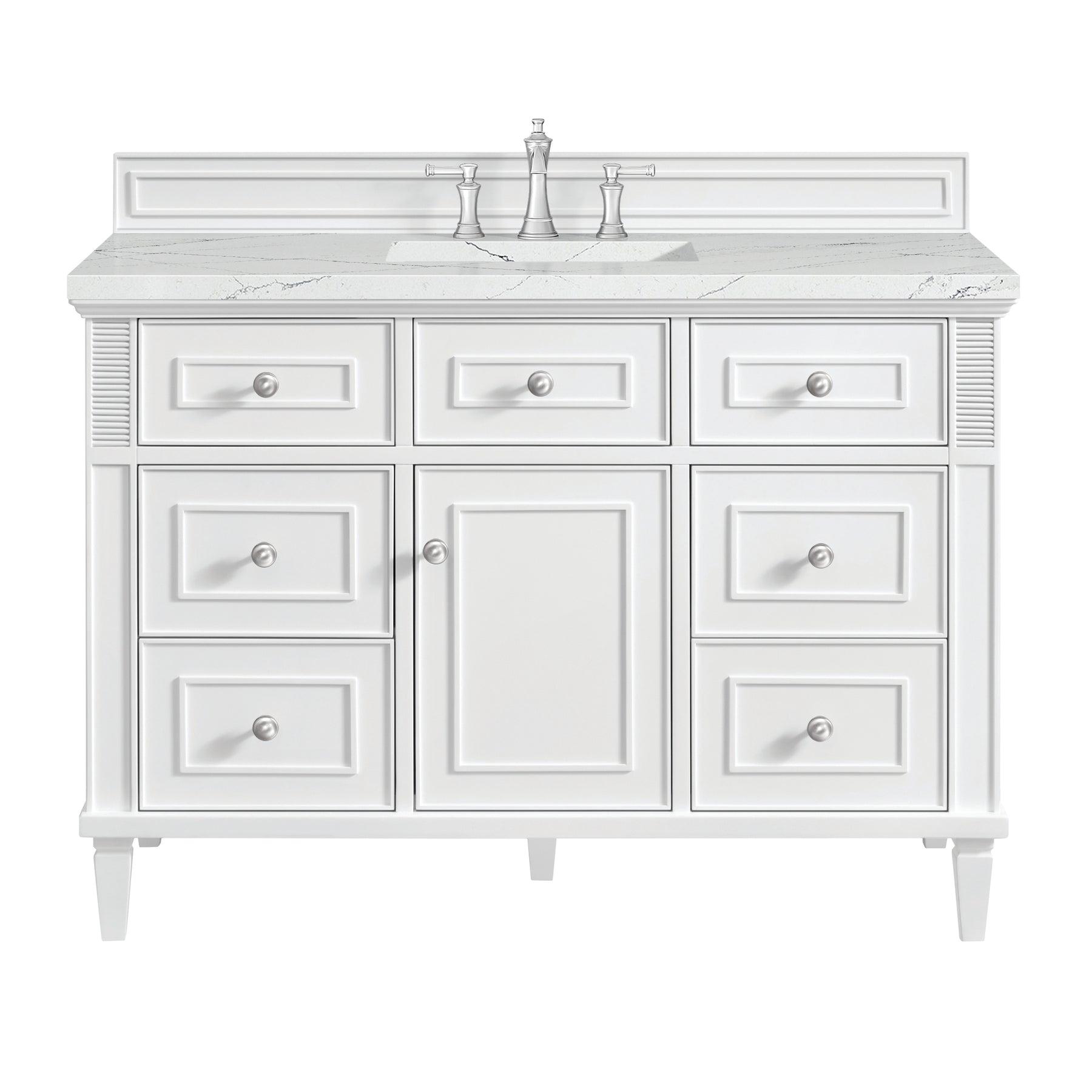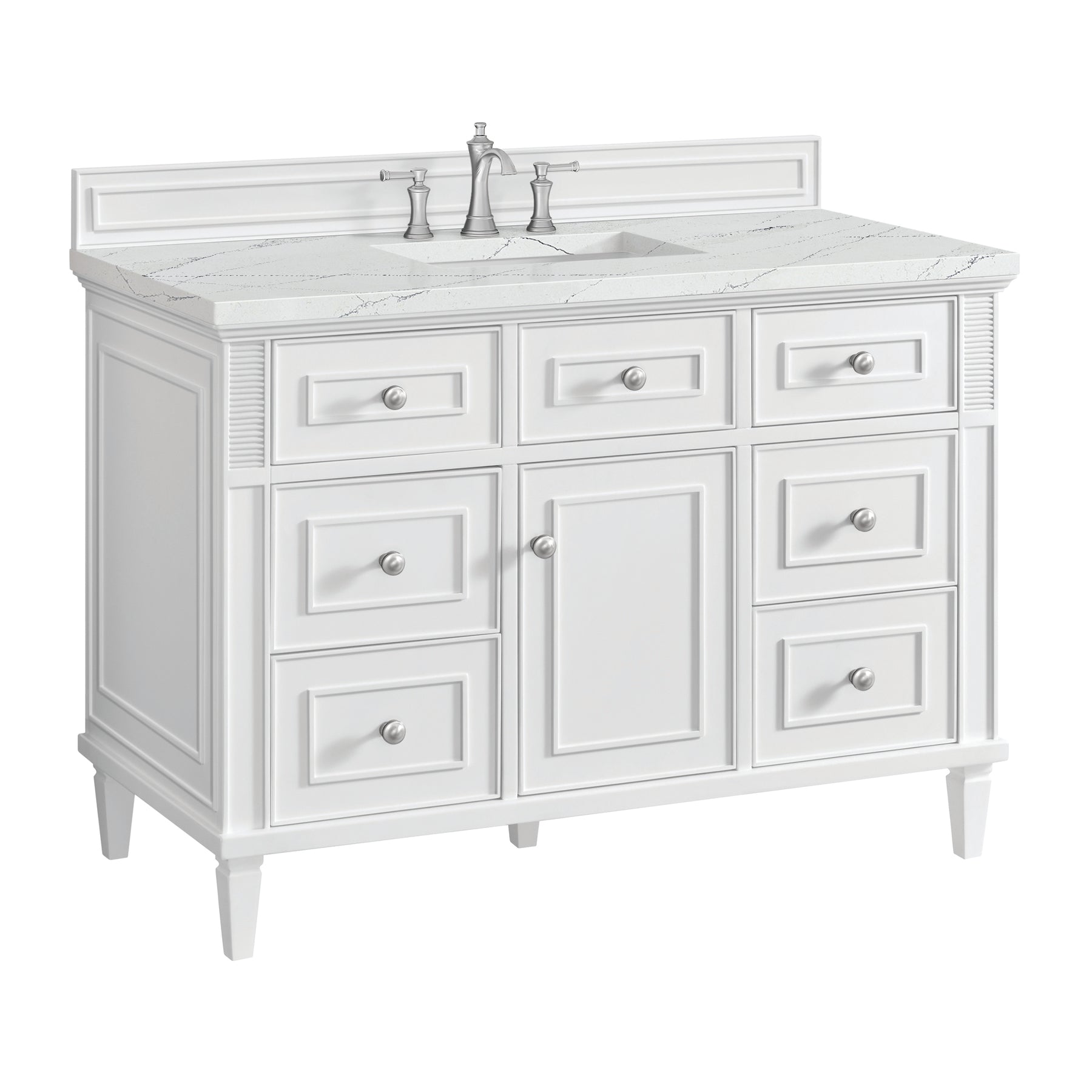 The Lorelai 48" Single Vanity by James Martin Vanities celebrates timeless design and exquisite finish details, combined with practical function. The Bright White finish is accented by coin-edge knobs in Satin Nickel which provides a sophisticated contrast. Reeded details and raised picture frame molding lend visual interest. This single-door cabinet opens to a spacious interior with a single shelf and a convenient USB/120V power outlet. Six standard full-extension drawers and one top-row tip-out drawer offer additional storage. The addition of a striking Ethereal Noctis Silestone top with undermount sink completes the look.