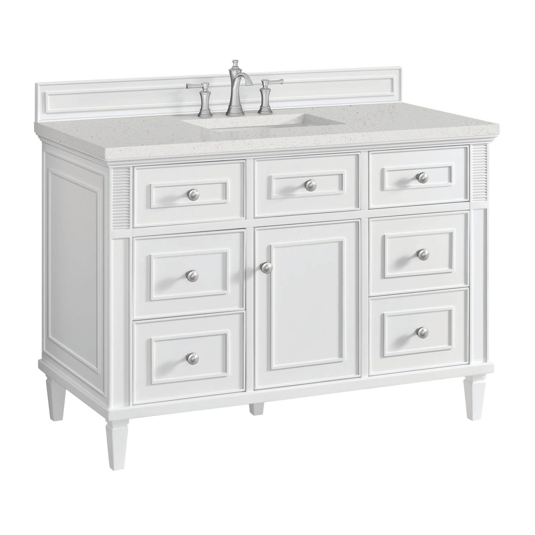 The 48" Lorelai Single Vanity celebrates timeless form and exquisite finish details, combined with practical function. The sophisticated Bright White finish is accented by reeded details, and clean, raised picture frame molding. Coin-edge knobs in Satin Nickel provide the perfect accent. This single-door cabinet opens to a spacious interior with a single shelf and a convenient USB/Electric power outlet. Six drawers plus one tip-out drawer offer additional storage space. The Lime Delight Silestone top lends warm, textured beige tones to perfectly complement the finish on the vanity.