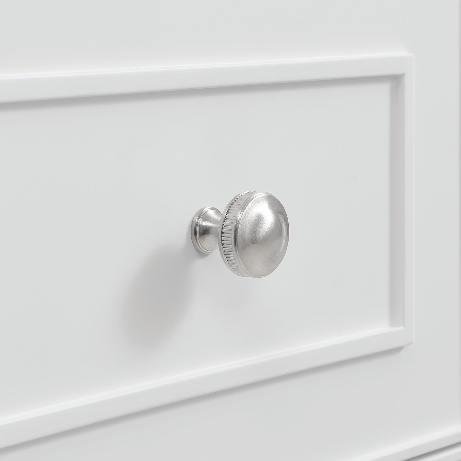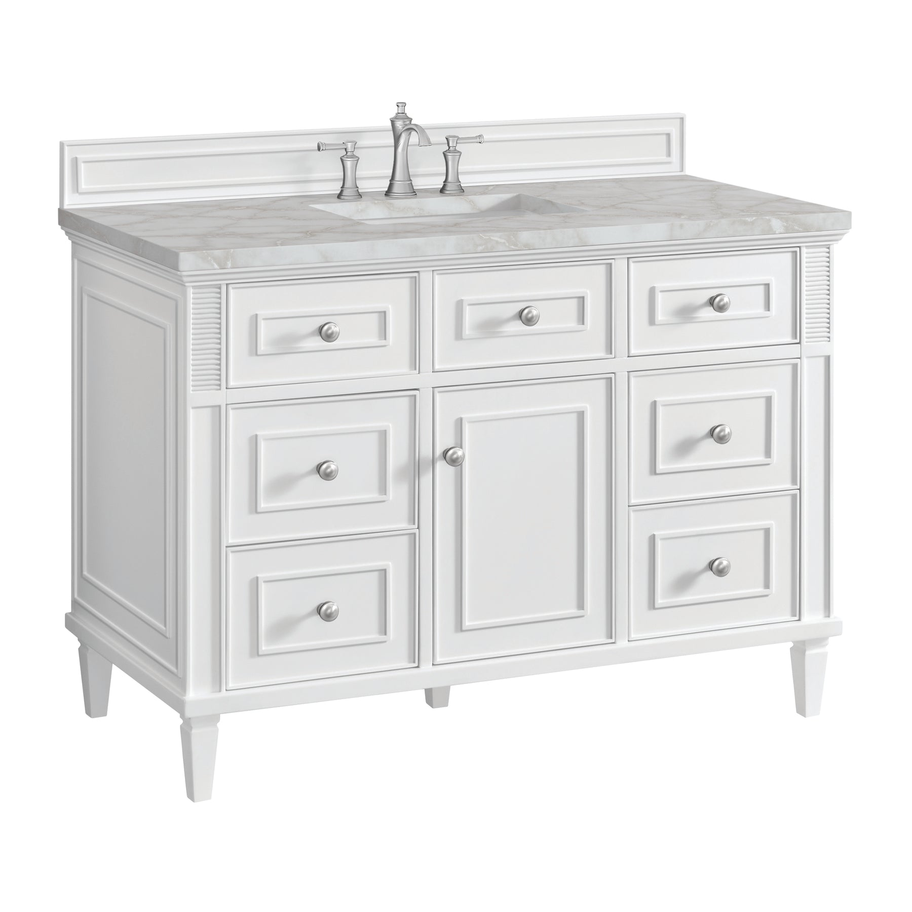The 48" Lorelai Single Vanity celebrates timeless form and exquisite finish details, combined with practical function. The sophisticated Bright White finish is accented by reeded details, and clean, raised picture frame molding. Coin-edge knobs in Satin Nickel provide the perfect accent. This single-door cabinet opens to a spacious interior with a single shelf and a convenient USB/Electric power outlet. Six drawers plus one tip-out drawer offer additional storage space. The finish is accented by the neutral background of the Victorian Silver Silestone top, boasting champagne metallic accents which seamlessly complete the look.