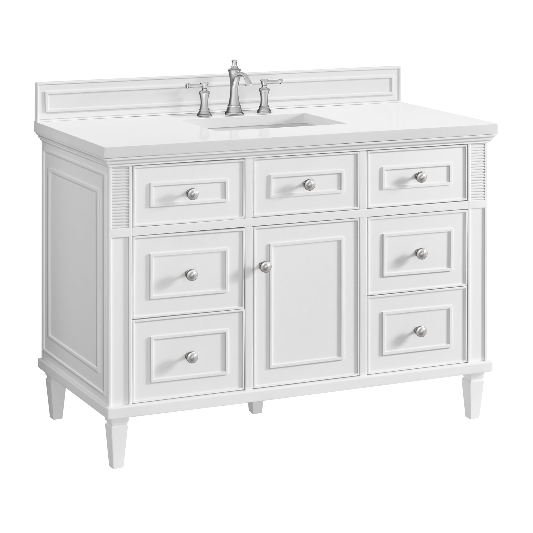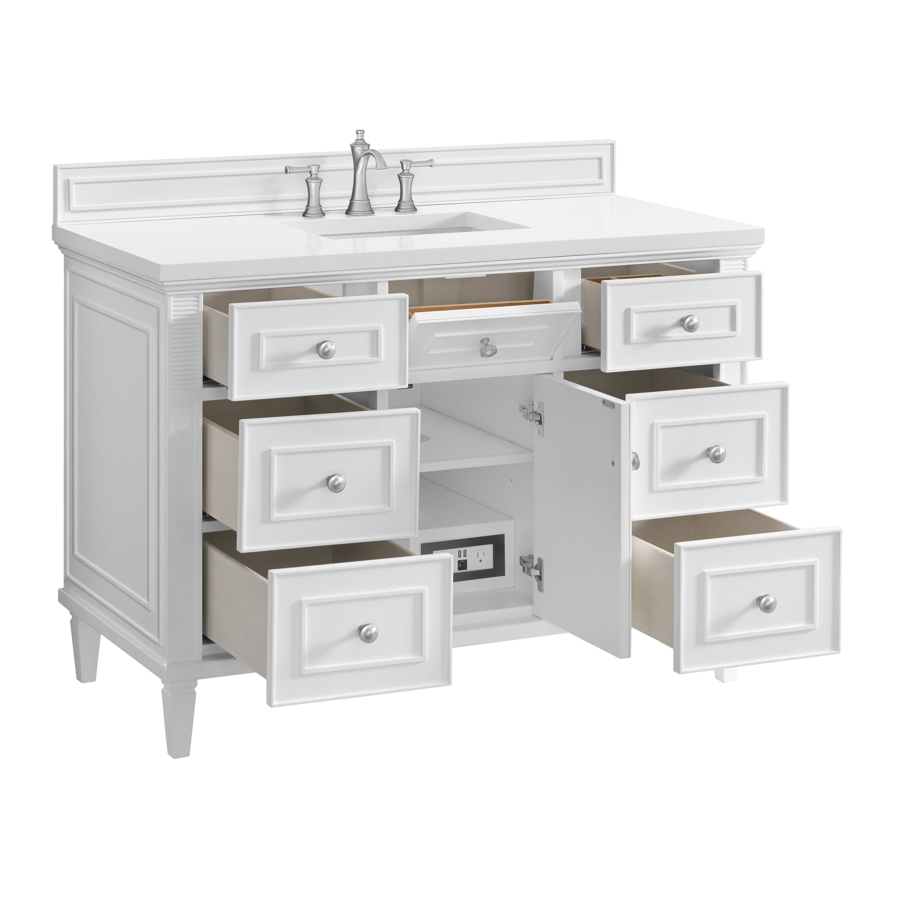 The 48" Lorelai Single Vanity celebrates timeless form and exquisite finish details, combined with practical function. The sophisticated Bright White finish is accented by reeded details, and clean, raised picture frame molding. Coin-edge knobs in Satin Nickel provide the perfect accent. This single-door cabinet opens to a spacious interior with a single shelf and a convenient USB/Electric power outlet. Six drawers plus one tip-out drawer offer additional storage space. With the addition of a classic White Zeus Silestone top and undermount sink, this vanity is a seamless integration of modern design and functionality.