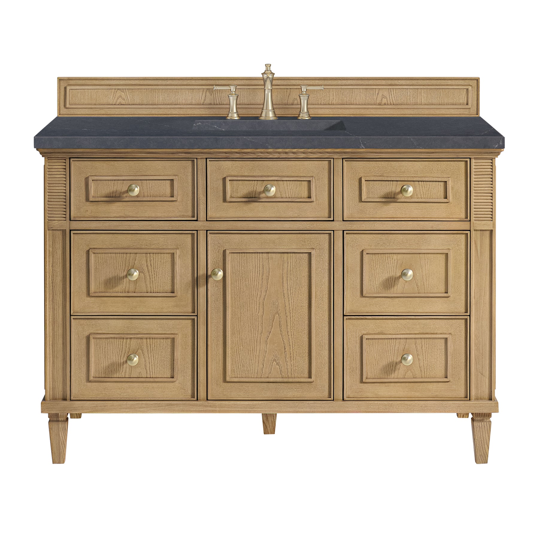 The 48" Lorelai Single Vanity celebrates timeless form and exquisite finish details, combined with practical function. The Light Natural Oak finish is accented by reeded details, and clean, raised picture frame molding. Coin-edge knobs in Champagne Brass provide the perfect accent. This single-door cabinet opens to a spacious interior with a single shelf and a convenient USB/Electric power outlet. Six drawers plus one tip-out drawer offer additional storage space. Completing this piece is a distinguished top, characterized by depth and a sense of movement with a suede finish. The Charcoal Soapstone Silestone top is a timeless statement to complete the look of your vanity.