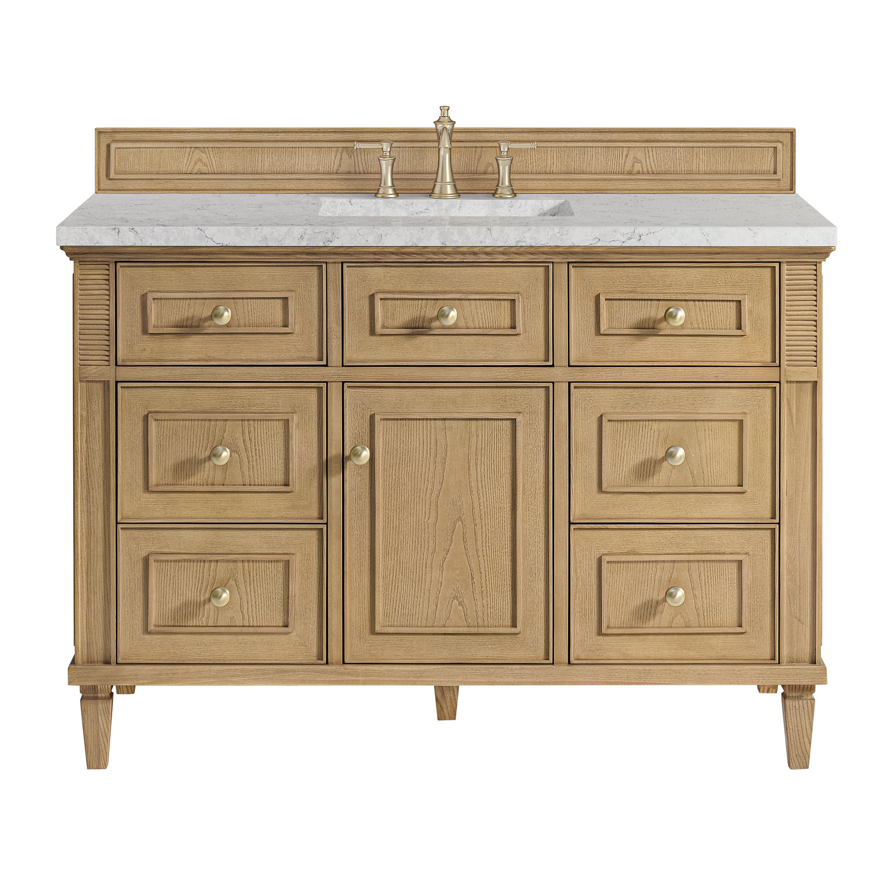 The 48" Lorelai Single Vanity celebrates timeless form and exquisite finish details, combined with practical function. The Light Natural Oak finish is accented by reeded details, and clean, raised picture frame molding. Coin-edge knobs in Champagne Brass provide the perfect accent. This single-door cabinet opens to a spacious interior with a single shelf and a convenient USB/Electric power outlet. Six drawers plus one tip-out drawer offer additional storage space. Completing the look is the Eternal Jasmine Pearl Silestone top by Cosentino, featuring an elegant white background with subtle marbleized swirls and dark Bleu-gray veining patterns.