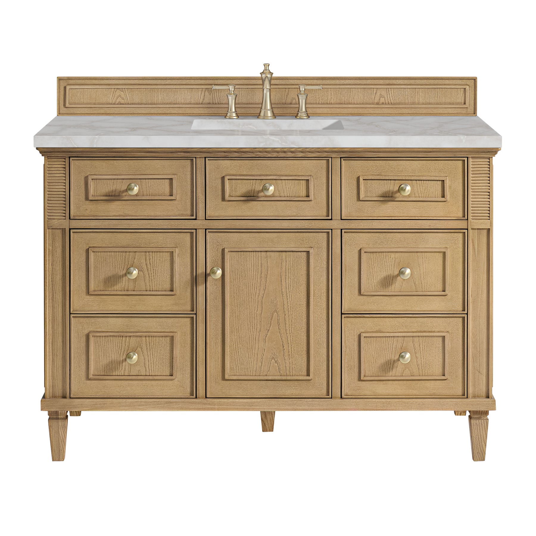 The 48" Lorelai Single Vanity celebrates timeless form and exquisite finish details, combined with practical function. The Light Natural Oak finish is accented by reeded details, and clean, raised picture frame molding. Coin-edge knobs in Champagne Brass provide the perfect accent. This single-door cabinet opens to a spacious interior with a single shelf and a convenient USB/Electric power outlet. Six drawers plus one tip-out drawer offer additional storage space. The finish is accented by the neutral background of the Victorian Silver Silestone top, boasting champagne metallic accents which seamlessly complete the look.