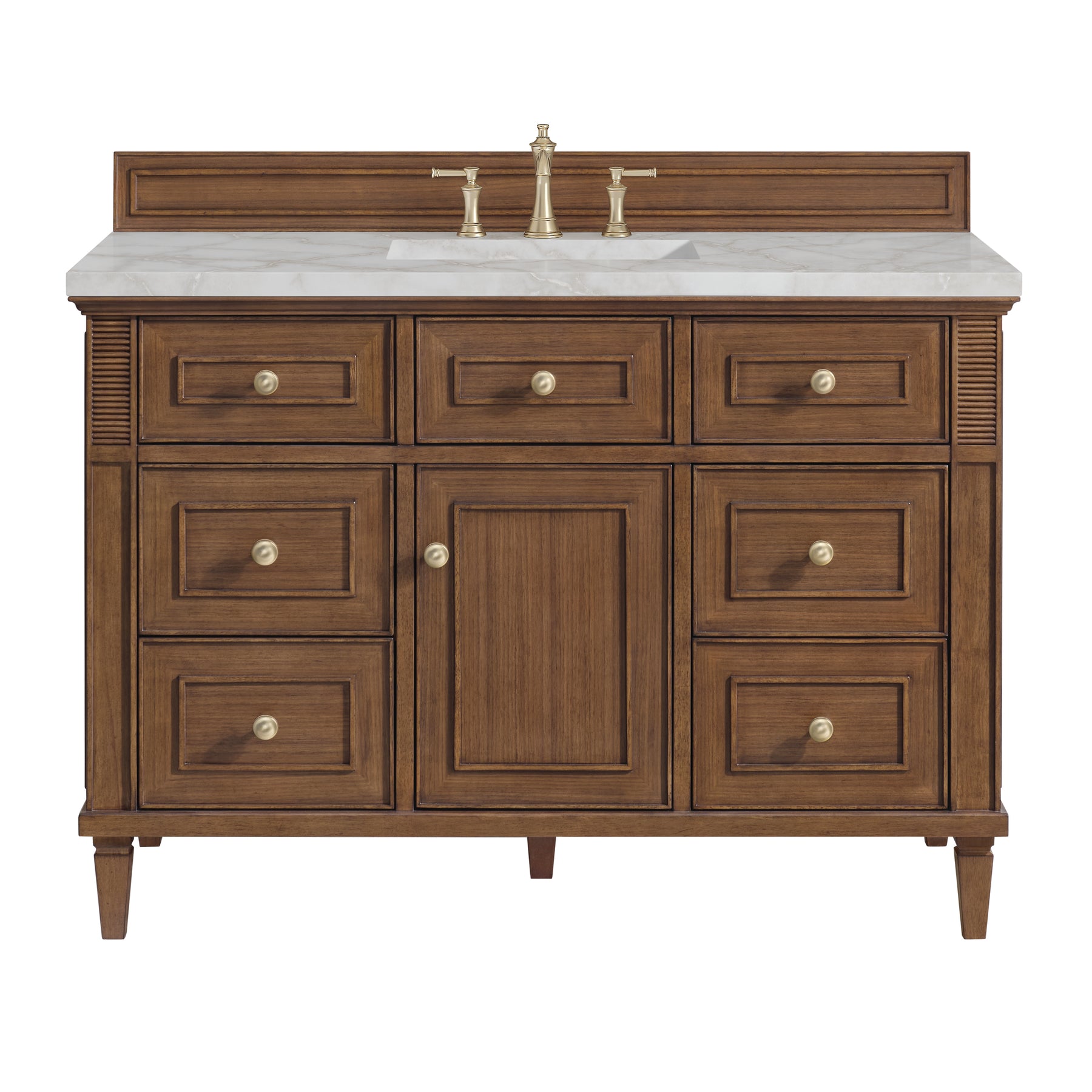 The Lorelai 48" Single Vanity by James Martin Vanities celebrates timeless design and exquisite finish details, combined with practical function. The rich Mid-Century Walnut finish is accented by coin-edge knobs in Champagne Brass which provides a sophisticated contrast. Reeded details and raised picture frame molding lend visual interest. This single-door cabinet opens to a spacious interior with a single shelf and a convenient USB/120V power outlet. Six standard full-extension drawers and one top-row tip-out drawer offer additional storage. The addition of a stunning Victorian Silver Silestone top with undermount sink completes the look.
