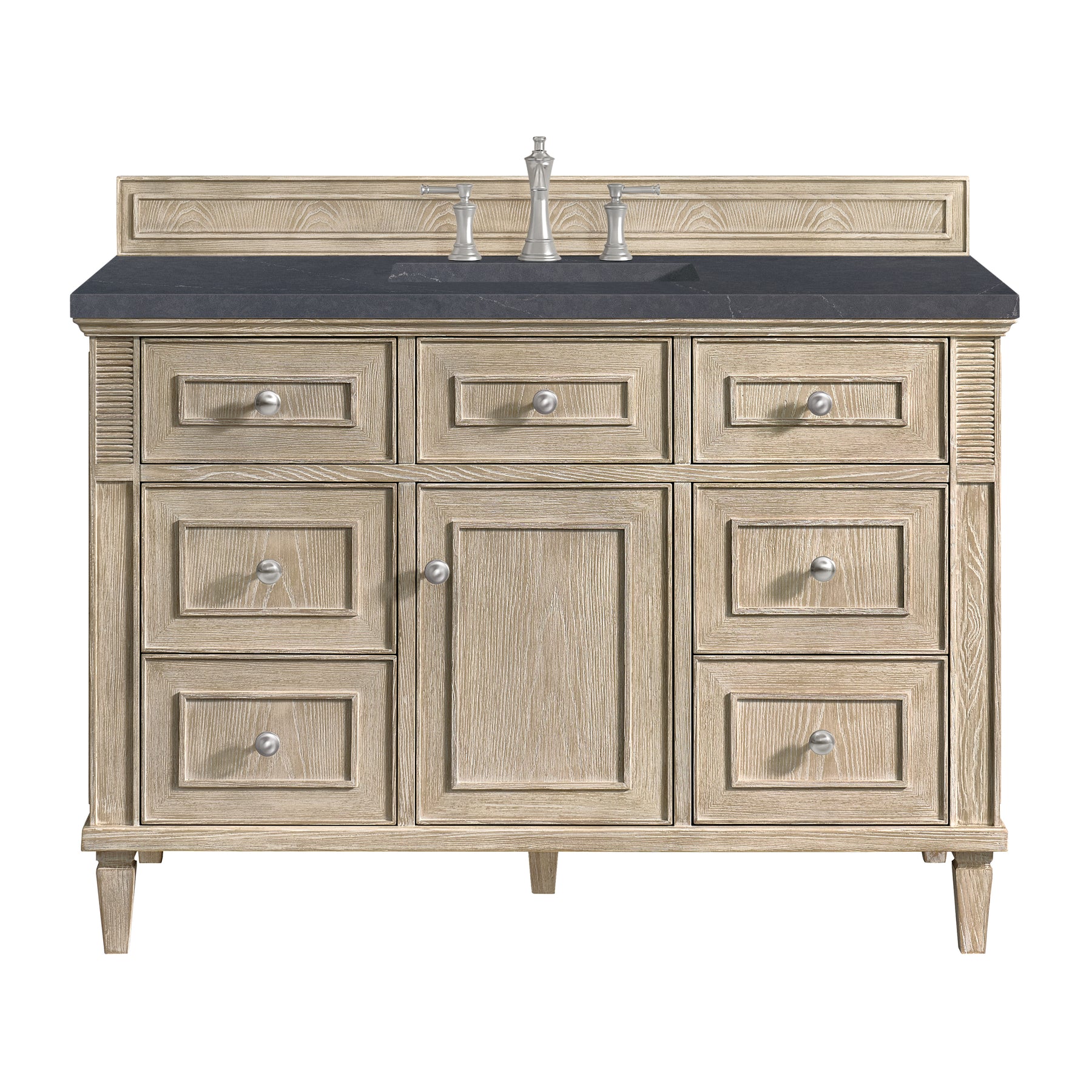 The 48" Lorelai Single Vanity celebrates timeless form and exquisite finish details, combined with practical function. The Whitewashed Oak finish is accented by reeded details, and clean, raised picture frame molding. Coin-edge knobs in Satin Nickel provide the perfect accent. This single-door cabinet opens to a spacious interior with a single shelf and a convenient USB/Electric power outlet. Six drawers plus one tip-out drawer offer additional storage space. Completing this piece is a distinguished top, characterized by depth and a sense of movement with a suede finish. The Charcoal Soapstone Silestone top is a timeless statement to complete the look of your vanity.