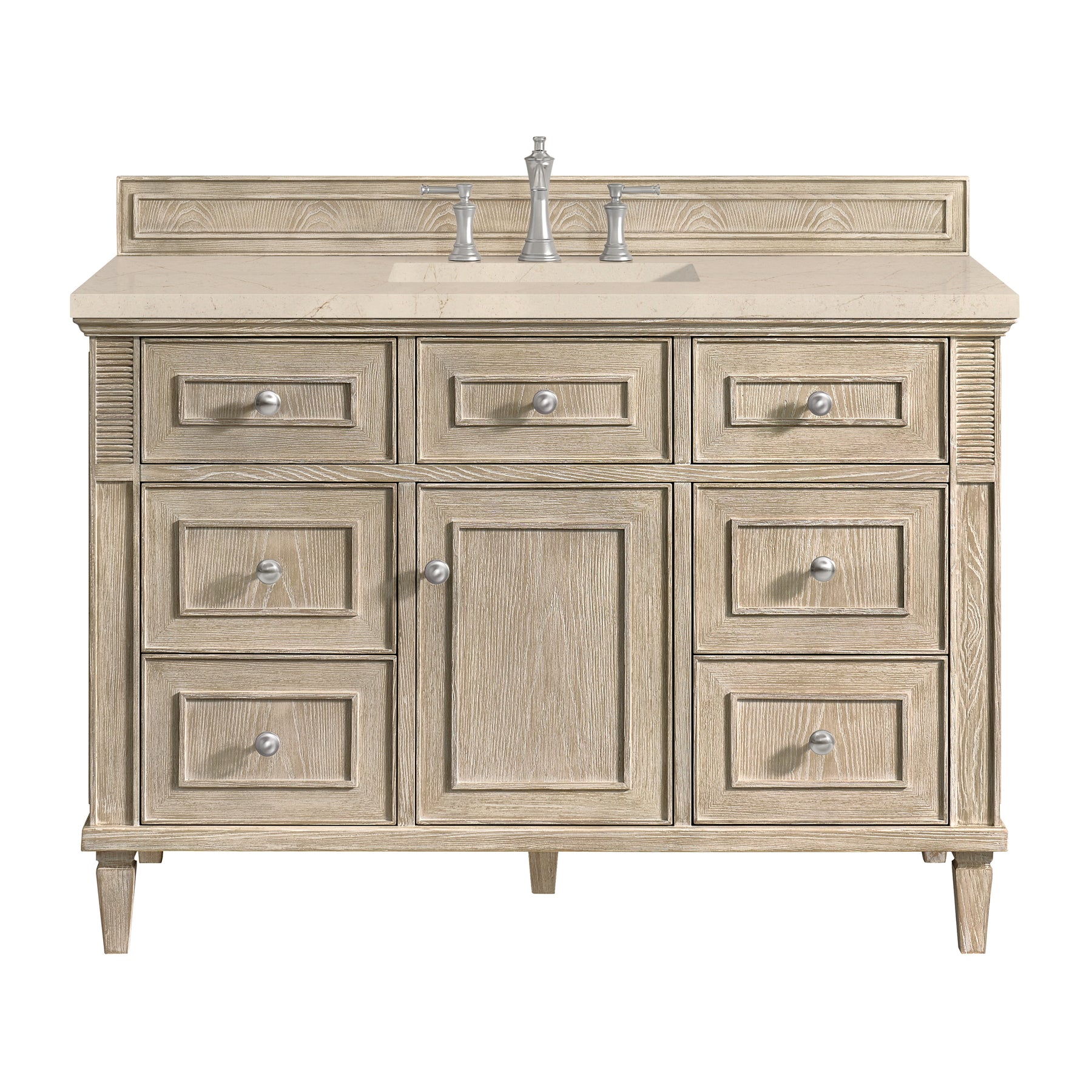 The 48" Lorelai Single Vanity celebrates timeless form and exquisite finish details, combined with practical function. The Whitewashed Oak finish is accented by reeded details, and clean, raised picture frame molding. Coin-edge knobs in Satin Nickel provide the perfect accent. This single-door cabinet opens to a spacious interior with a single shelf and a convenient USB/Electric power outlet. Six drawers plus one tip-out drawer offer additional storage space. The Eternal Marfil Silestone top by Cosentino incorporates classic, warm tones. Finally, an undermount rectangular sink completes this striking look.