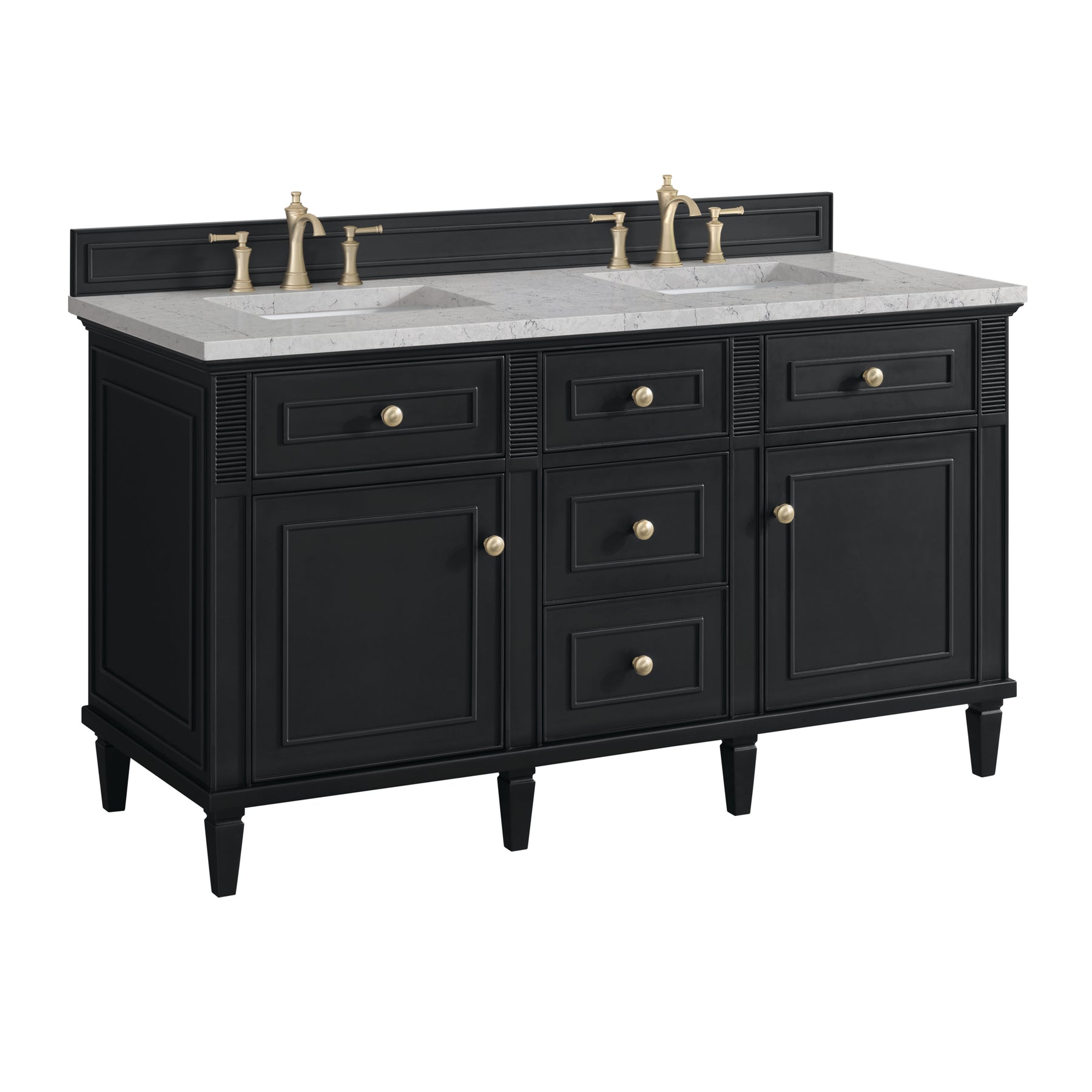 The Lorelai 60" Double Vanity by James Martin Vanities celebrates timeless design and exquisite finish details, combined with practical function. The rich Black Onyx finish is accented by coin-edge knobs in Champagne Brass which provides a sophisticated contrast. Reeded details and raised picture frame molding lend visual interest. The two-door cabinet opens to reveal a spacious interior with single shelves and a convenient USB/120V power outlet behind each door. Three standard full-extension drawers and two top-row tip-out drawers offer additional storage. The addition of a beautiful Eternal Jasmine Pearl Silestone top with undermount sink completes the look.