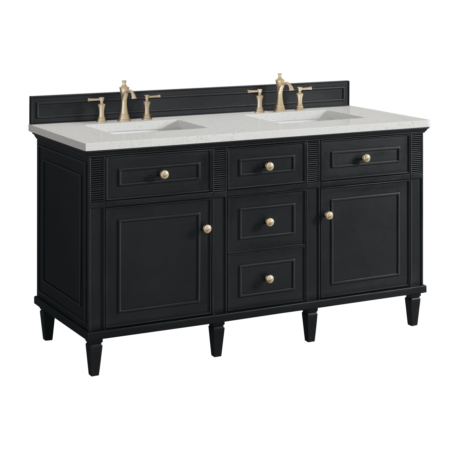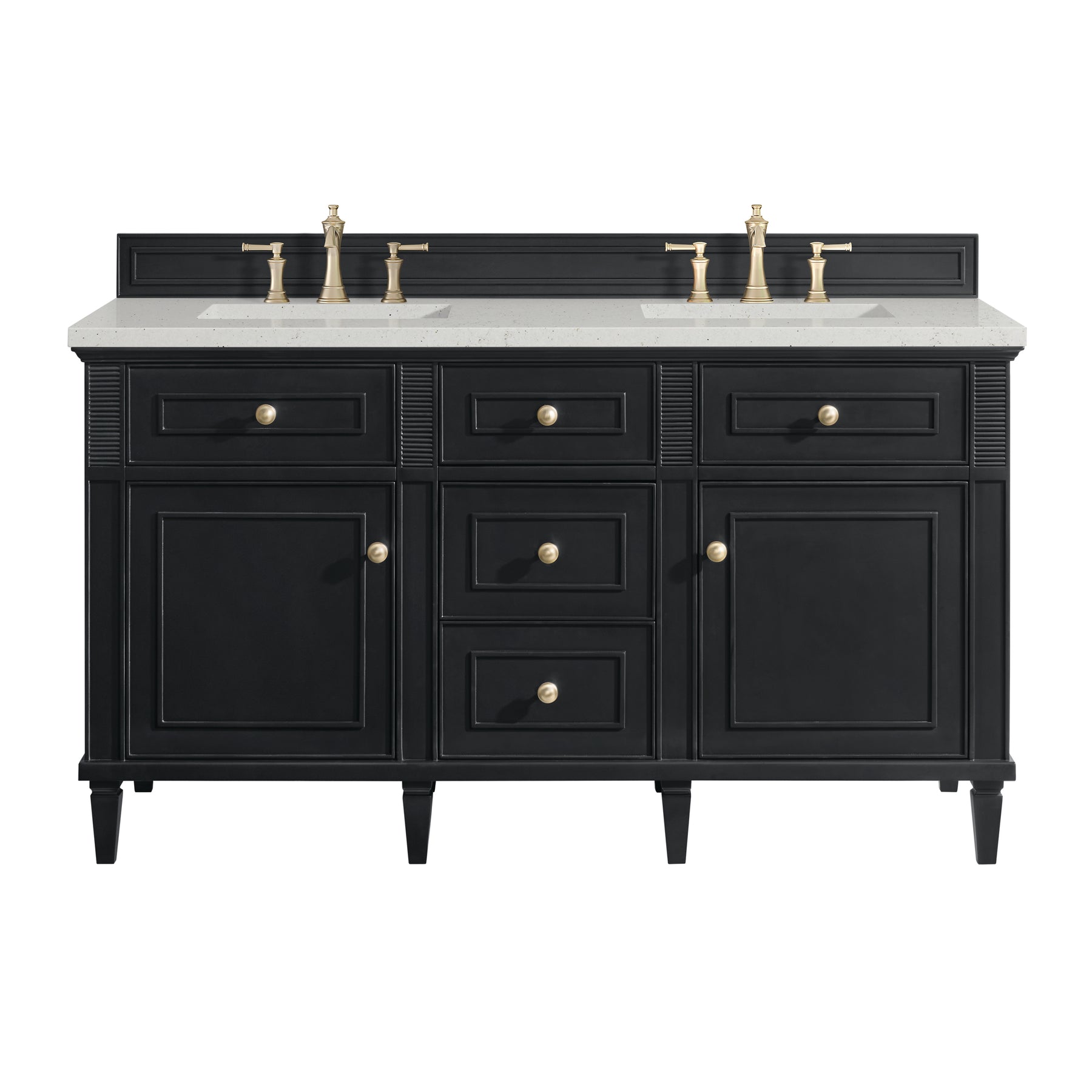 The 60" Lorelai Double Vanity celebrates timeless form and exquisite finish details, combined with practical function. The rich Black Onyx finish is accented by coin-edge knobs in Champagne Brass which provides an sophisticated contrast. Reeded details, and clean, and raised picture frame molding lend visual interest. This two-door cabinet opens to a spacious interior with shelves and convenient USB/Electric power outlets. Three traditional drawers and two tip-outs offer additional storage space. The Lime Delight Silestone top lends warm, textured beige tones to perfectly complement the dark finish on the vanity.