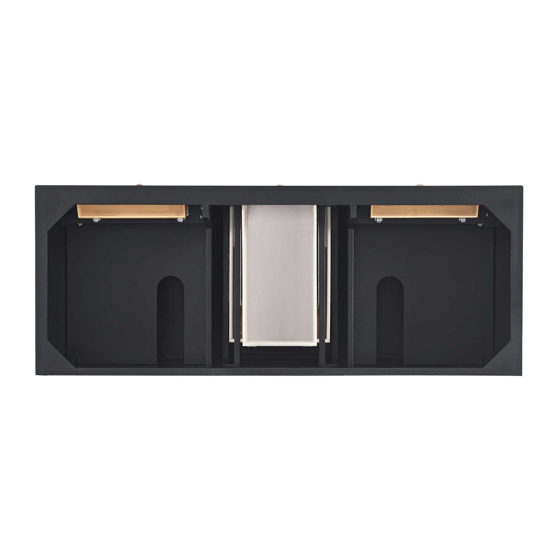 The Lorelai 60" Double Vanity by James Martin Vanities celebrates timeless design and exquisite finish details, combined with practical function. The rich Black Onyx finish is accented by coin-edge knobs in Champagne Brass which provides a sophisticated contrast. Reeded details and raised picture frame molding lend visual interest. The two-door cabinet opens to reveal a spacious interior with single shelves and a convenient USB/120V power outlet behind each door. Three standard full-extension drawers and two top-row tip-out drawers offer additional storage. The addition of a stunning Victorian Silver Silestone top with undermount sink completes the look.