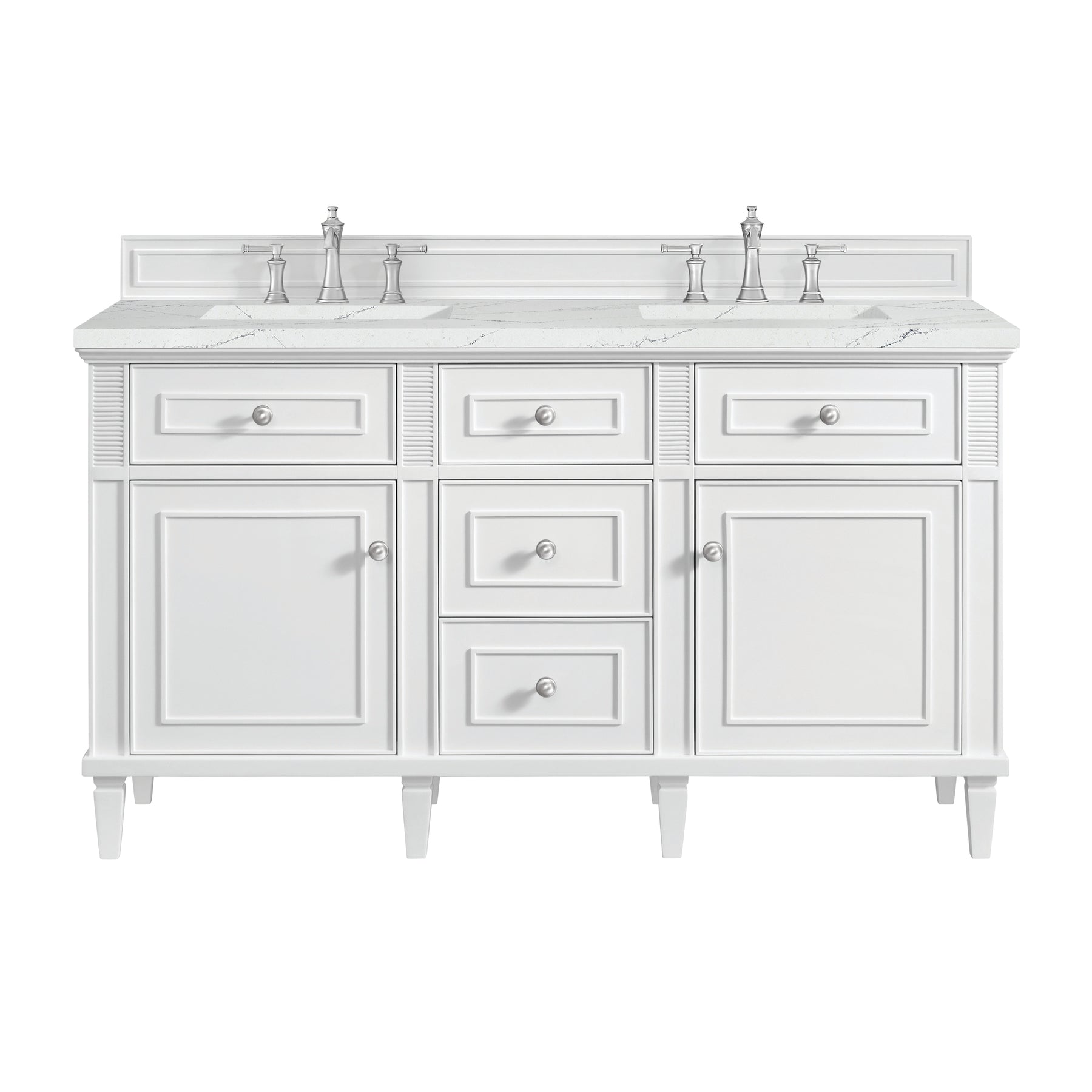 The 60" Lorelai Double Vanity celebrates timeless form and exquisite finish details, combined with practical function. The sophisticated Bright White finish is accented by reeded details, and clean, raised picture frame molding. Coin-edge knobs in Satin Nickel provide the perfect accent. This two-door cabinet opens to a spacious interior with shelves and convenient USB/Electric power outlets. Three traditional drawers and two tip-outs offer additional storage space. The addition of a Ethereal Noctis Silestone top by Cosentino with undermount rectangular sink completes this timeless bathroom centerpiece with its modern, intricate black and gray nuances which add contrast and elegance to the white background.