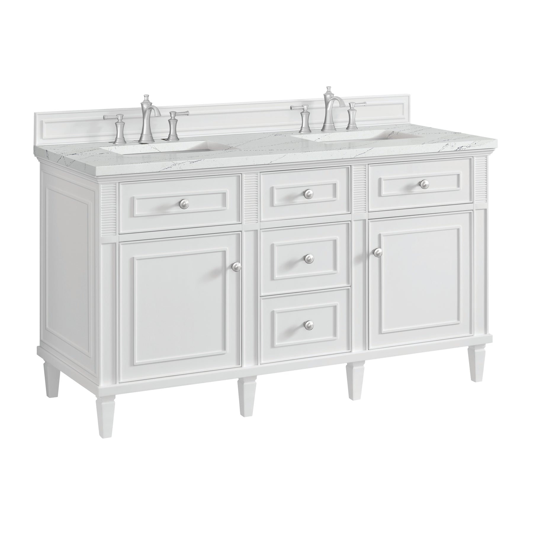 The Lorelai 60" Double Vanity by James Martin Vanities celebrates timeless design and exquisite finish details, combined with practical function. The Bright White finish is accented by coin-edge knobs in Satin Nickel which provides a sophisticated contrast. Reeded details and raised picture frame molding lend visual interest. The two-door cabinet opens to reveal a spacious interior with single shelves and a convenient USB/120V power outlet behind each door. Three standard full-extension drawers and two top-row tip-out drawers offer additional storage. The addition of a striking Ethereal Noctis Silestone top with undermount sink completes the look.