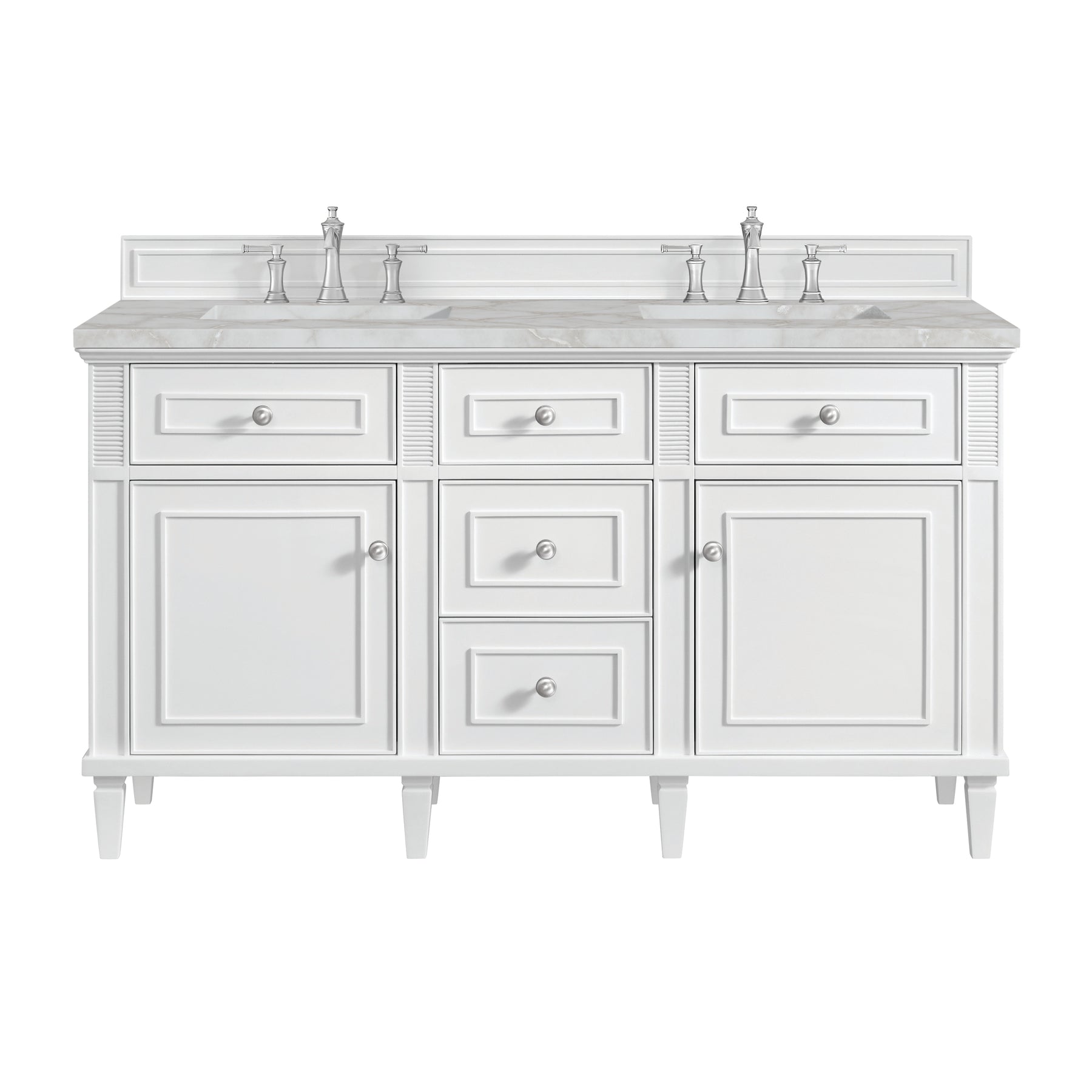 The Lorelai 60" Double Vanity by James Martin Vanities celebrates timeless design and exquisite finish details, combined with practical function. The Bright White finish is accented by coin-edge knobs in Satin Nickel which provides a sophisticated contrast. Reeded details and raised picture frame molding lend visual interest. The two-door cabinet opens to reveal a spacious interior with single shelves and a convenient USB/120V power outlet behind each door. Three standard full-extension drawers and two top-row tip-out drawers offer additional storage. The addition of a stunning Victorian Silver Silestone top with undermount sink completes the look.