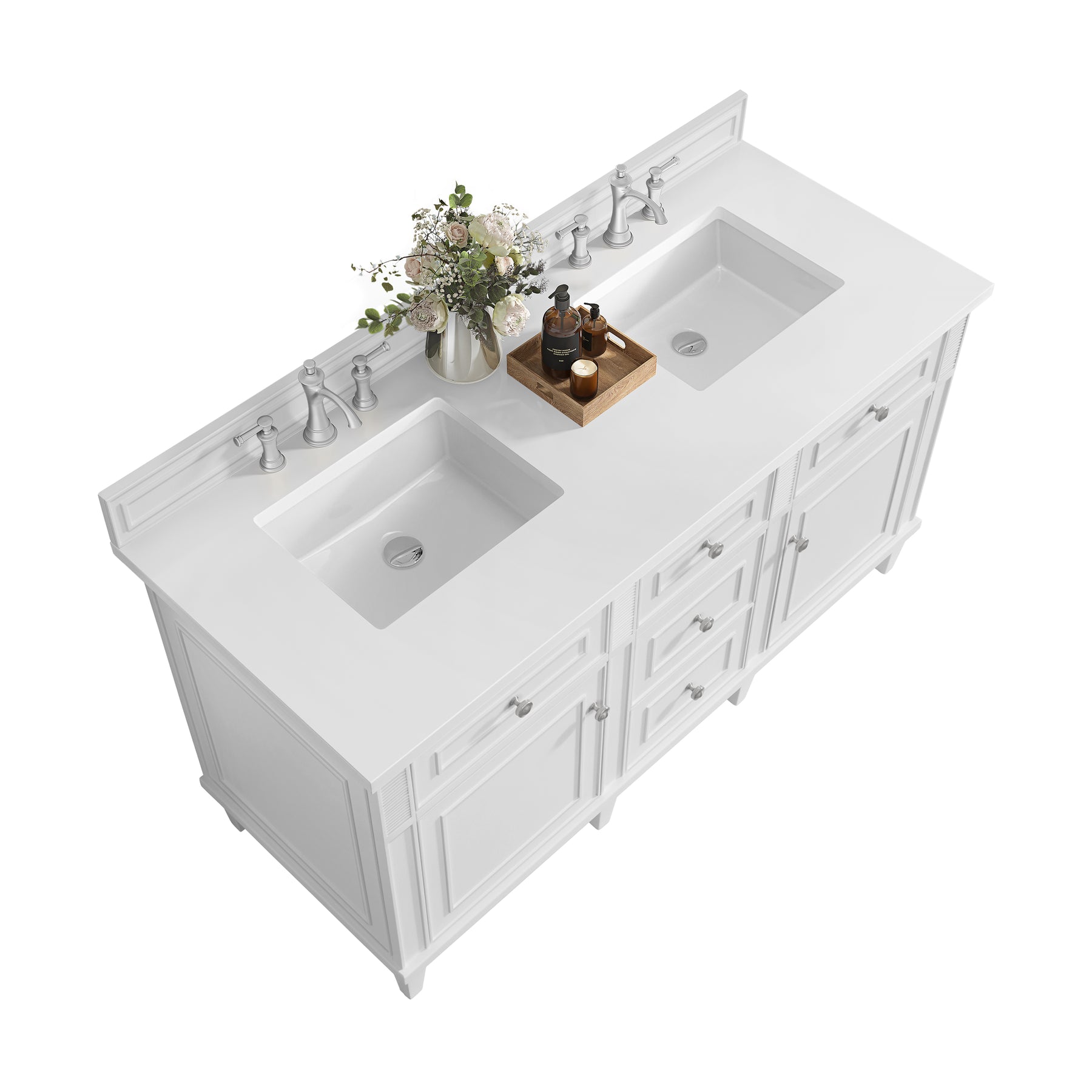 The 60" Lorelai Double Vanity celebrates timeless form and exquisite finish details, combined with practical function. The sophisticated Bright White finish is accented by reeded details, and clean, raised picture frame molding. Coin-edge knobs in Satin Nickel provide the perfect accent. This two-door cabinet opens to a spacious interior with shelves and convenient USB/Electric power outlets. Three traditional drawers and two tip-outs offer additional storage space. With the addition of a classic White Zeus Silestone top and undermount sink, this vanity is a seamless integration of modern design and functionality.