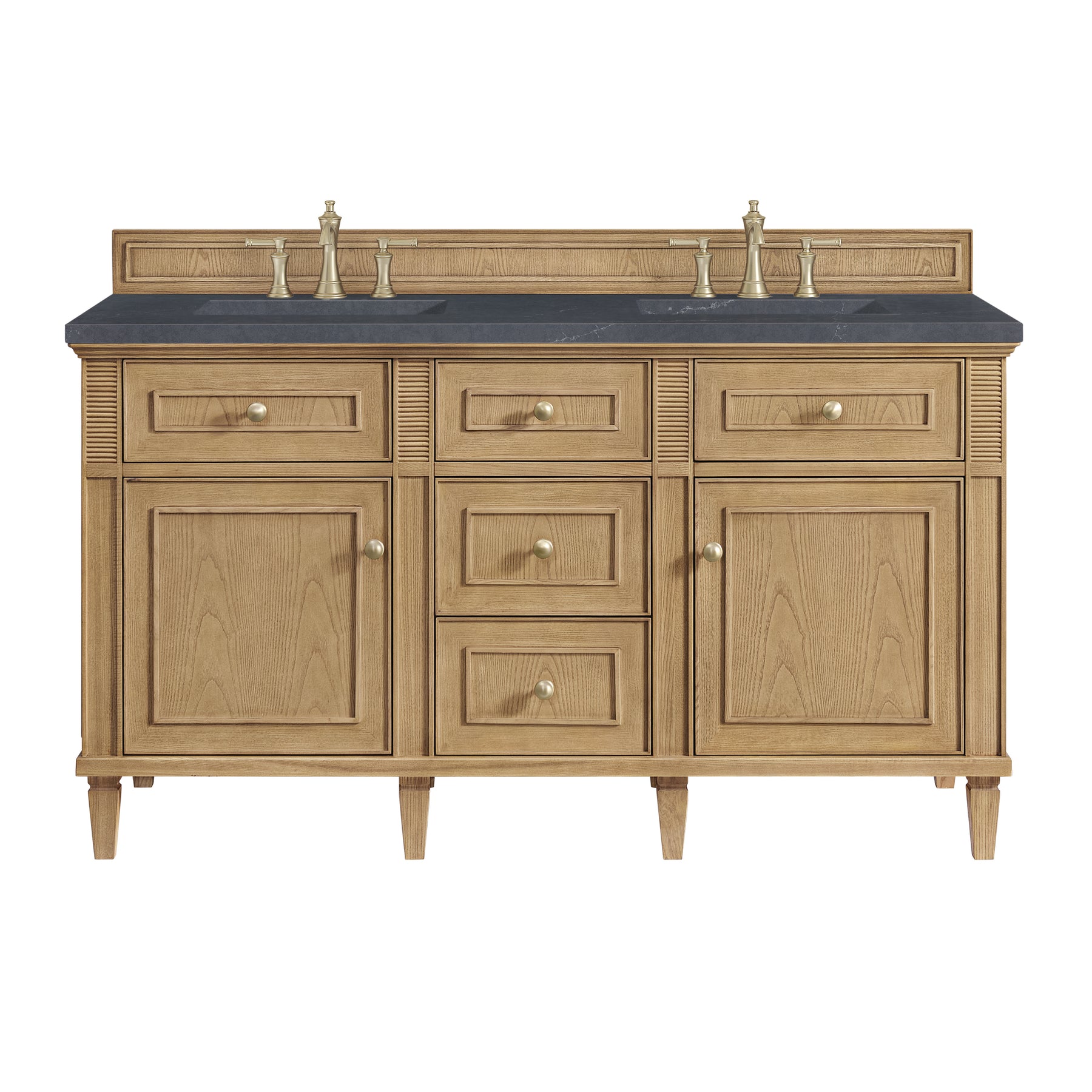 The 60" Lorelai Double Vanity celebrates timeless form and exquisite finish details, combined with practical function. The Light Natural Oak finish is accented by reeded details, and clean, raised picture frame molding. Coin-edge knobs in Champagne Brass provide the perfect accent. This two-door cabinet opens to a spacious interior with shelves and convenient USB/Electric power outlets. Three traditional drawers and two tip-outs offer additional storage space. Completing this piece is a distinguished top, characterized by depth and a sense of movement with a suede finish. The Charcoal Soapstone Silestone top is a timeless statement to complete the look of your vanity.