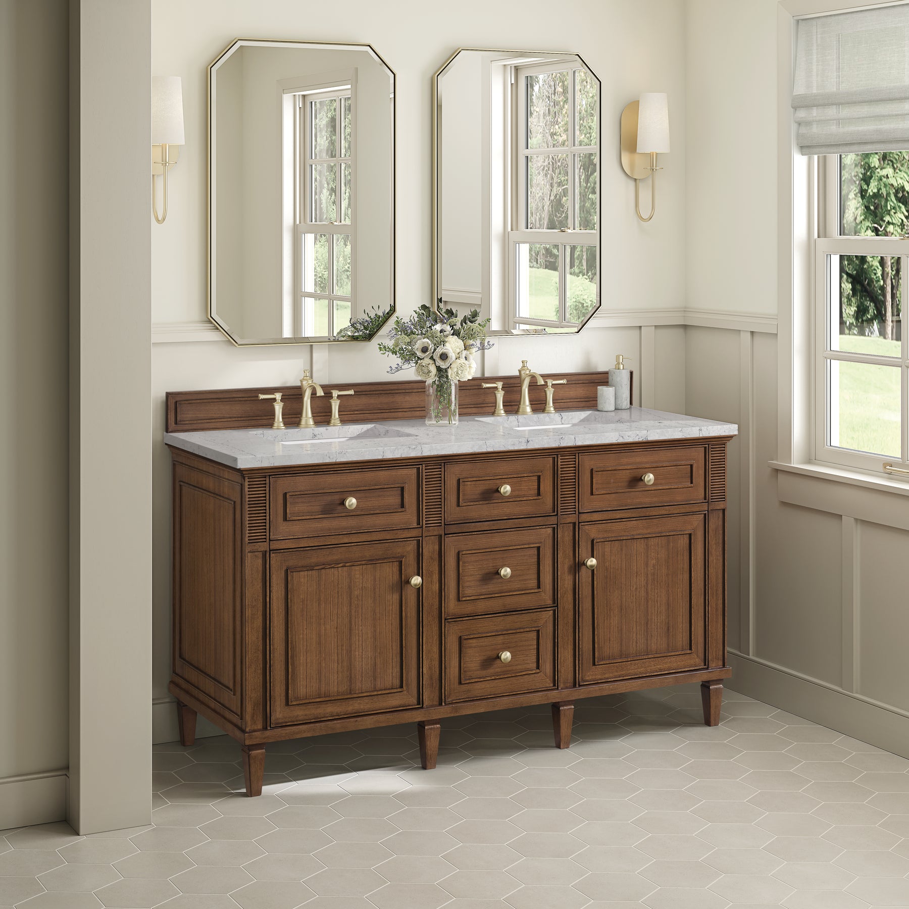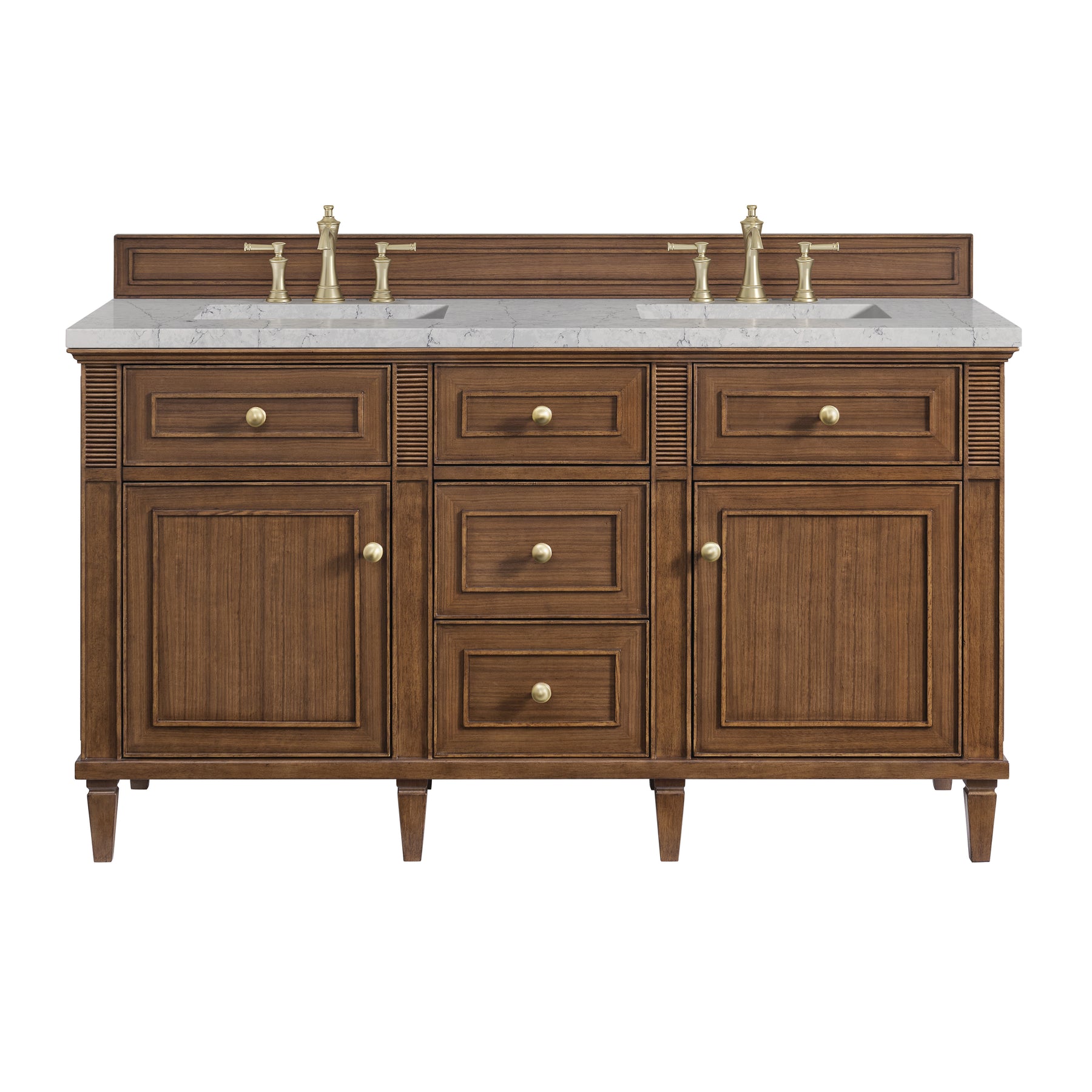 The 60" Lorelai Double Vanity celebrates timeless form and exquisite finish details, combined with practical function. The beauty of the natural grains in the walnut veneer is accented by reeded details, and clean, raised picture frame molding. The decorative, coin-edge knobs in Champagne Brass provide the perfect complement to the Mid-Century Walnut finish. This two-door cabinet opens to a spacious interior with shelves and convenient USB/Electric power outlets. Three traditional drawers and two tip-outs offer additional storage space. Completing the look is the Eternal Jasmine Pearl Silestone top by Cosentino, featuring an elegant white background with subtle marbleized swirls and dark Bleu-gray veining patterns.