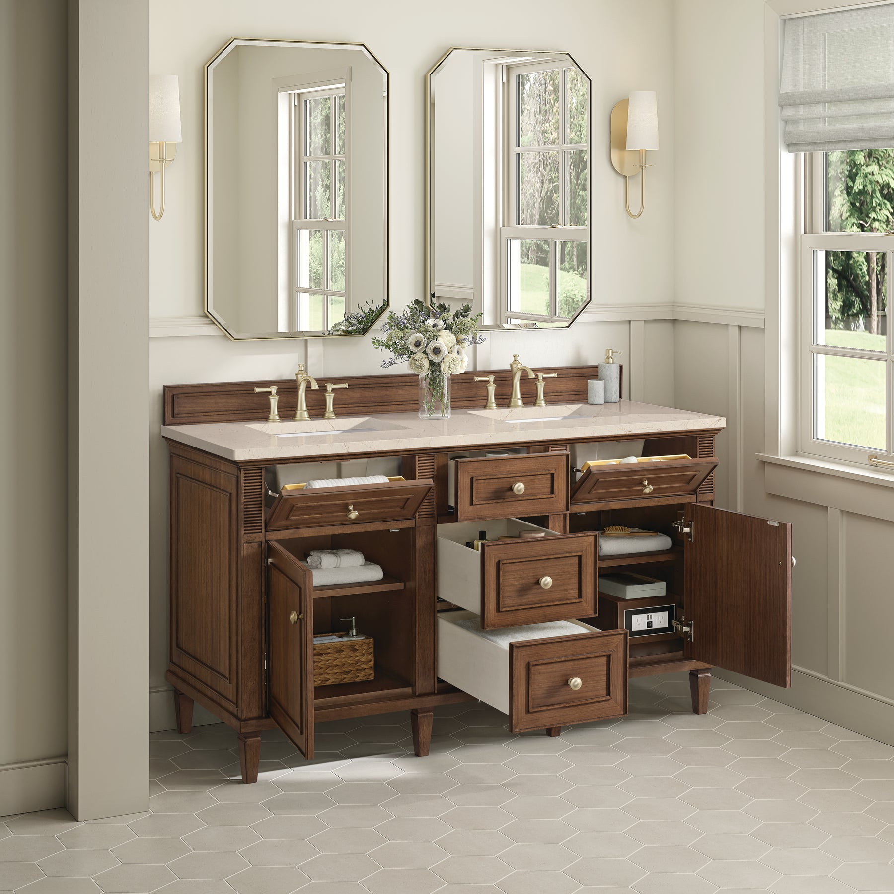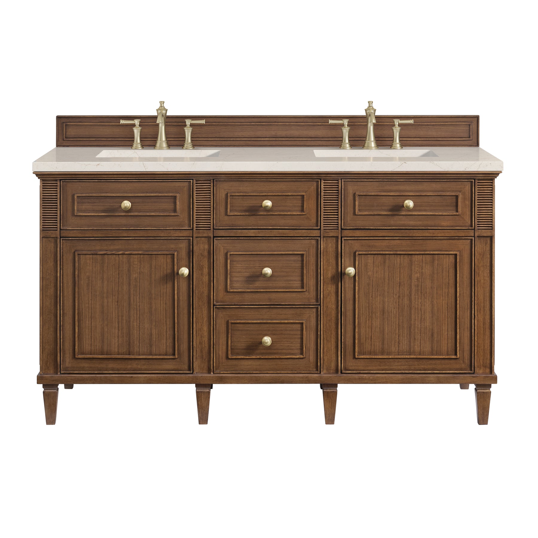 The 60" Lorelai Double Vanity celebrates timeless form and exquisite finish details, combined with practical function. The beauty of the natural grains in the walnut veneer is accented by reeded details, and clean, raised picture frame molding. The decorative, coin-edge knobs in Champagne Brass provide the perfect complement to the Mid-Century Walnut finish. This two-door cabinet opens to a spacious interior with shelves and convenient USB/Electric power outlets. Three traditional drawers and two tip-outs offer additional storage space. The Eternal Marfil Silestone top by Cosentino incorporates classic, warm tones. Finally, an undermount rectangular sink completes this striking look.