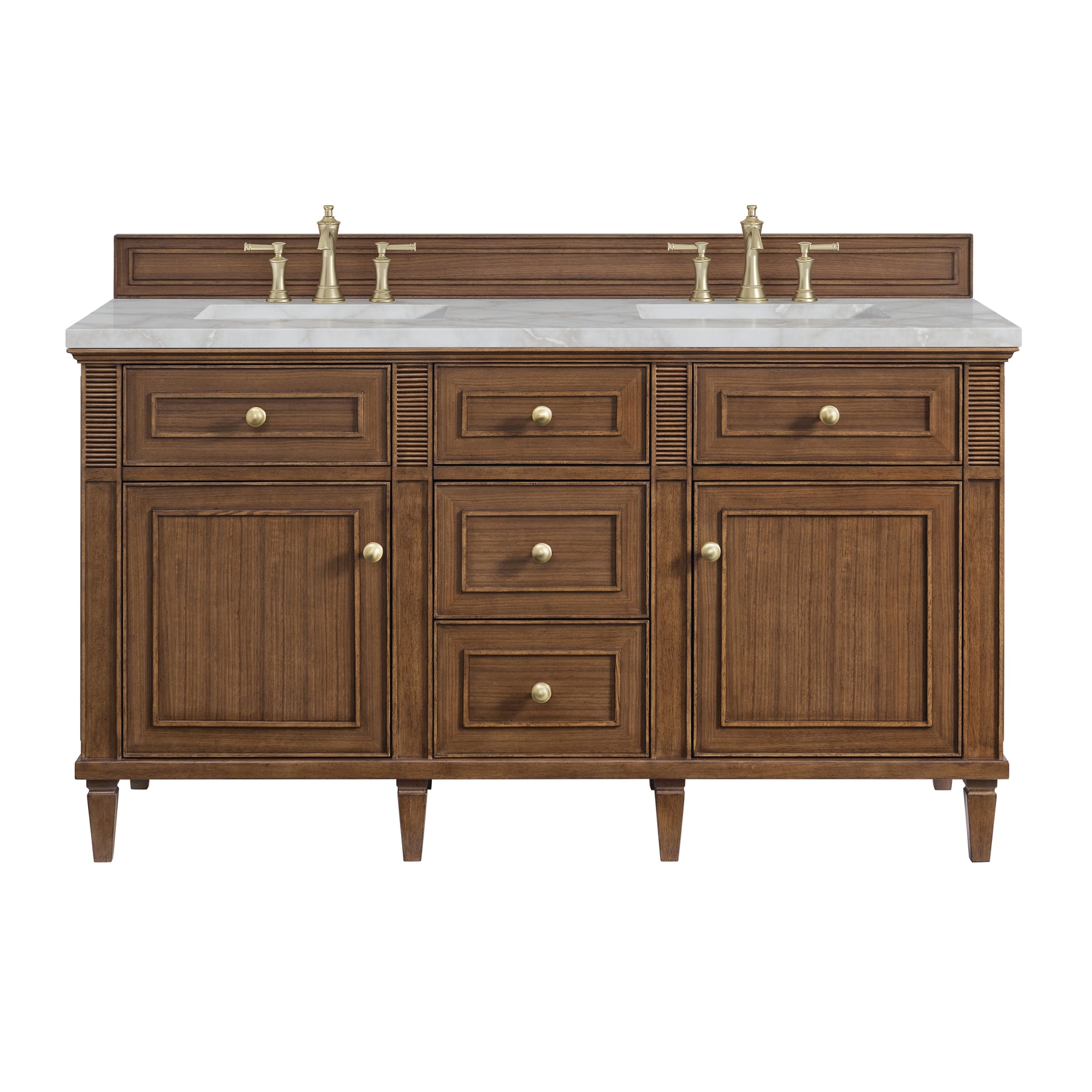 The 60" Lorelai Double Vanity celebrates timeless form and exquisite finish details, combined with practical function. The beauty of the natural grains in the walnut veneer is accented by reeded details, and clean, raised picture frame molding. The decorative, coin-edge knobs in Champagne Brass provide the perfect complement to the Mid-Century Walnut finish. This two-door cabinet opens to a spacious interior with shelves and convenient USB/Electric power outlets. Three traditional drawers and two tip-outs offer additional storage space. The finish is accented by the neutral background of the Victorian Silver Silestone top, boasting champagne metallic accents which seamlessly complete the look.