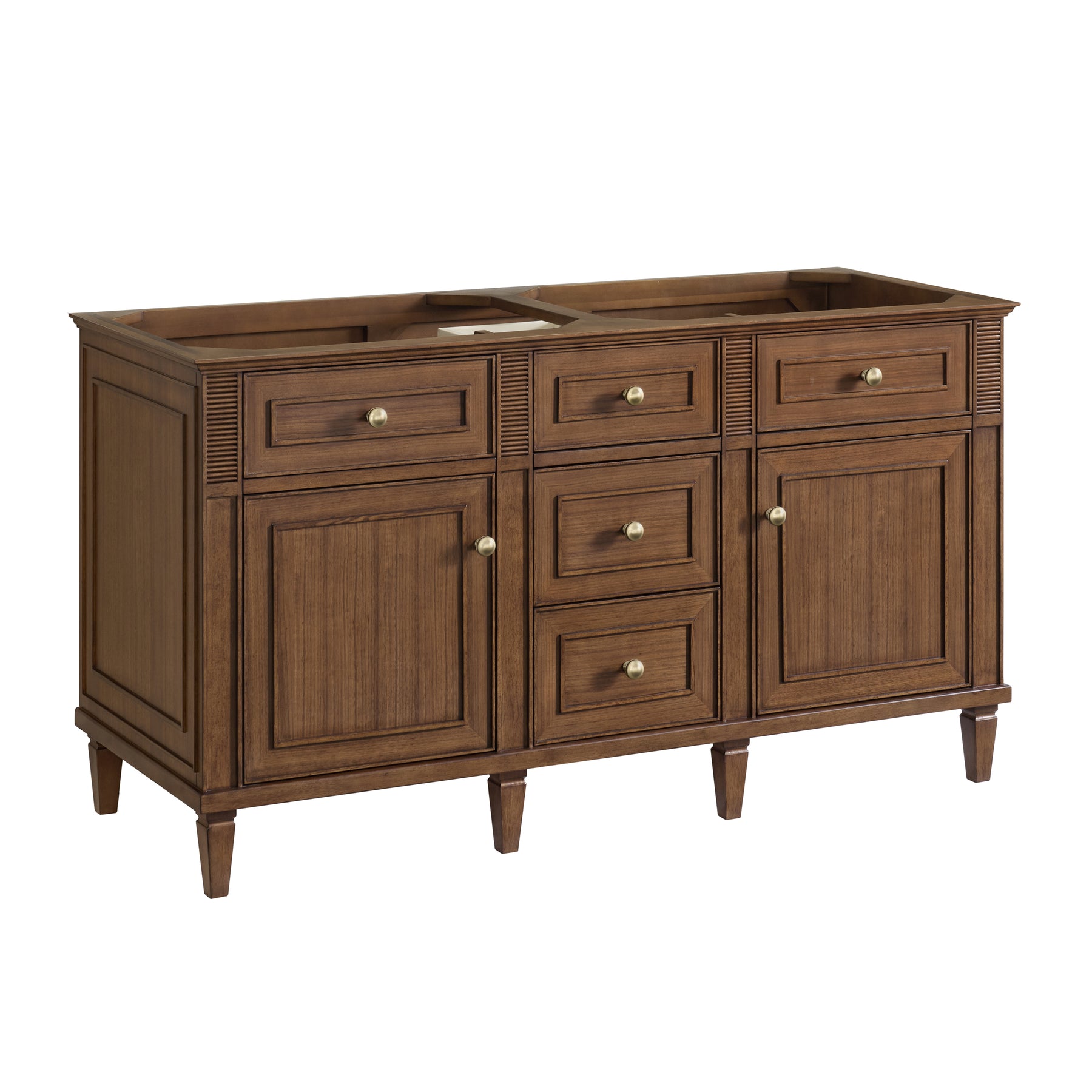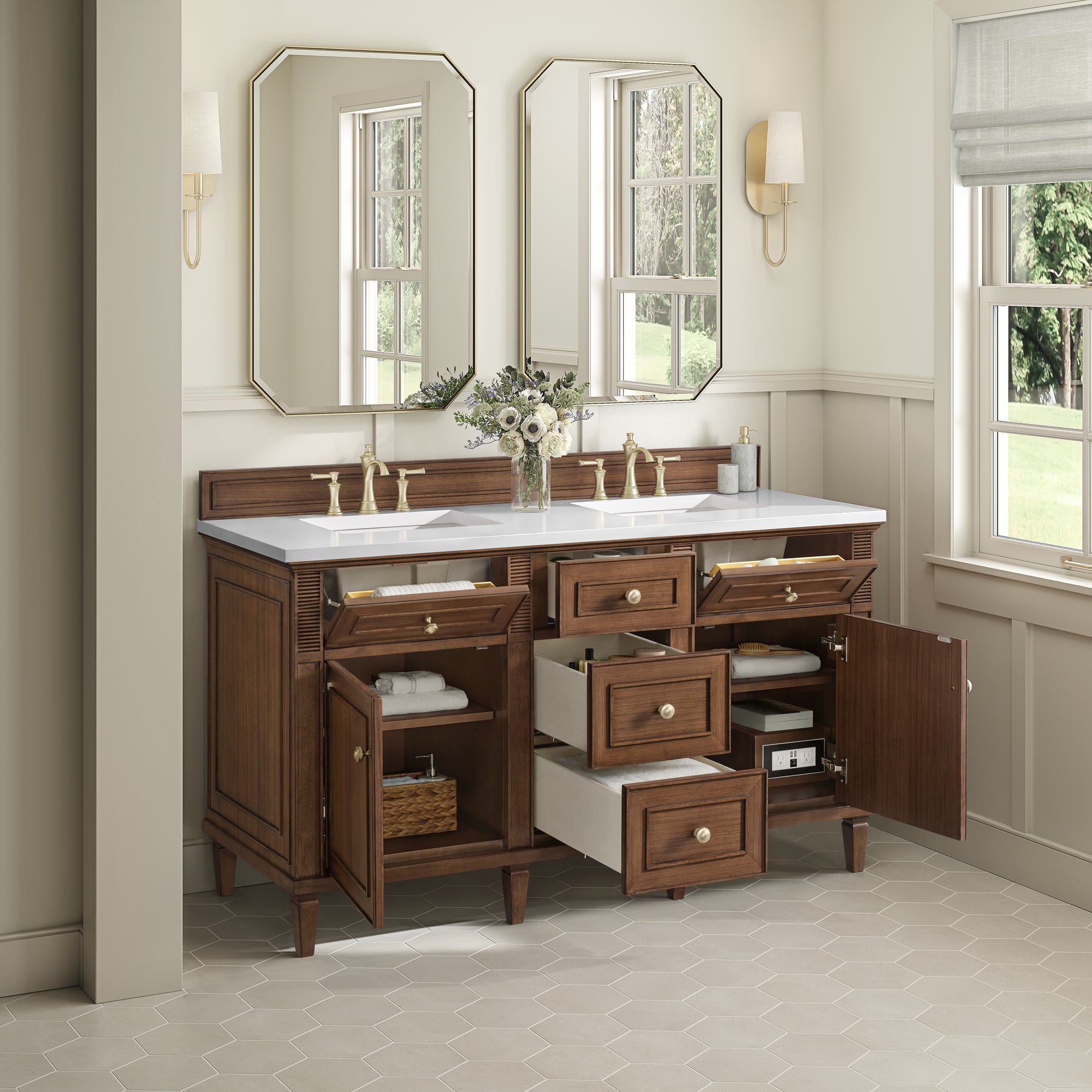 The 60" Lorelai Double Vanity celebrates timeless form and exquisite finish details, combined with practical function. The beauty of the natural grains in the walnut veneer is accented by reeded details, and clean, raised picture frame molding. The decorative, coin-edge knobs in Champagne Brass provide the perfect complement to the Mid-Century Walnut finish. This two-door cabinet opens to a spacious interior with shelves and convenient USB/Electric power outlets. Three traditional drawers and two tip-outs offer additional storage space. With the addition of a classic White Zeus Silestone top and undermount sink, this vanity is a seamless integration of modern design and functionality.