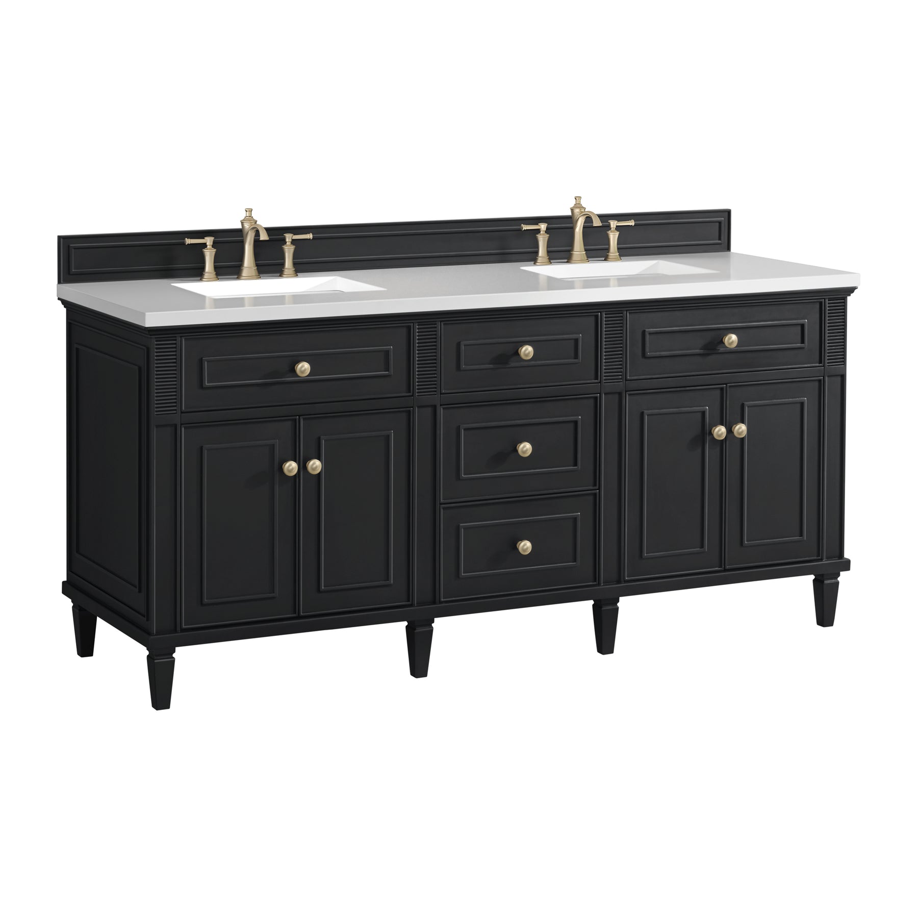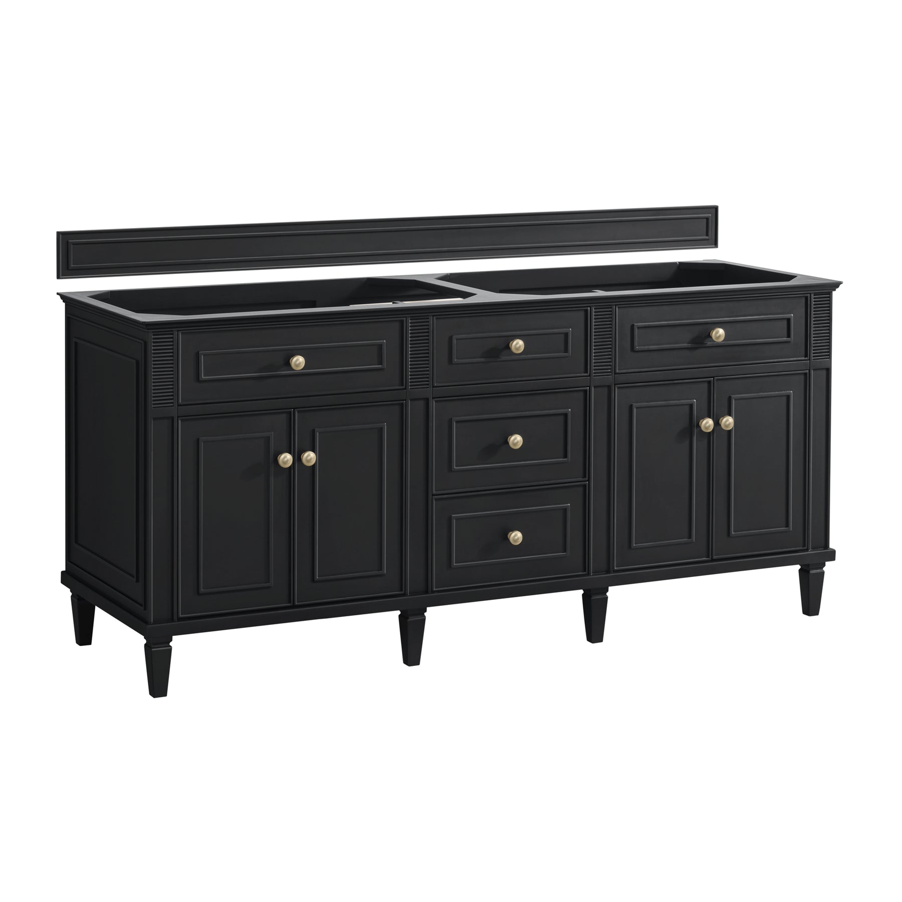 The 72” Lorelai Double Vanity celebrates timeless form and exquisite finish details, combined with practical function. The rich Black Onyx finish is accented by coin-edge knobs in Champagne Brass which provides an sophisticated contrast. Reeded details, and clean, and raised picture frame molding lend visual interest. This four-door cabinet opens to spacious interior with shelves and convenient USB/Electric power outlets. Three traditional drawers and two tip-outs offer additional storage space. Choose one of our tops with undermount, rectangular sinks to perfectly complete this masterpiece.