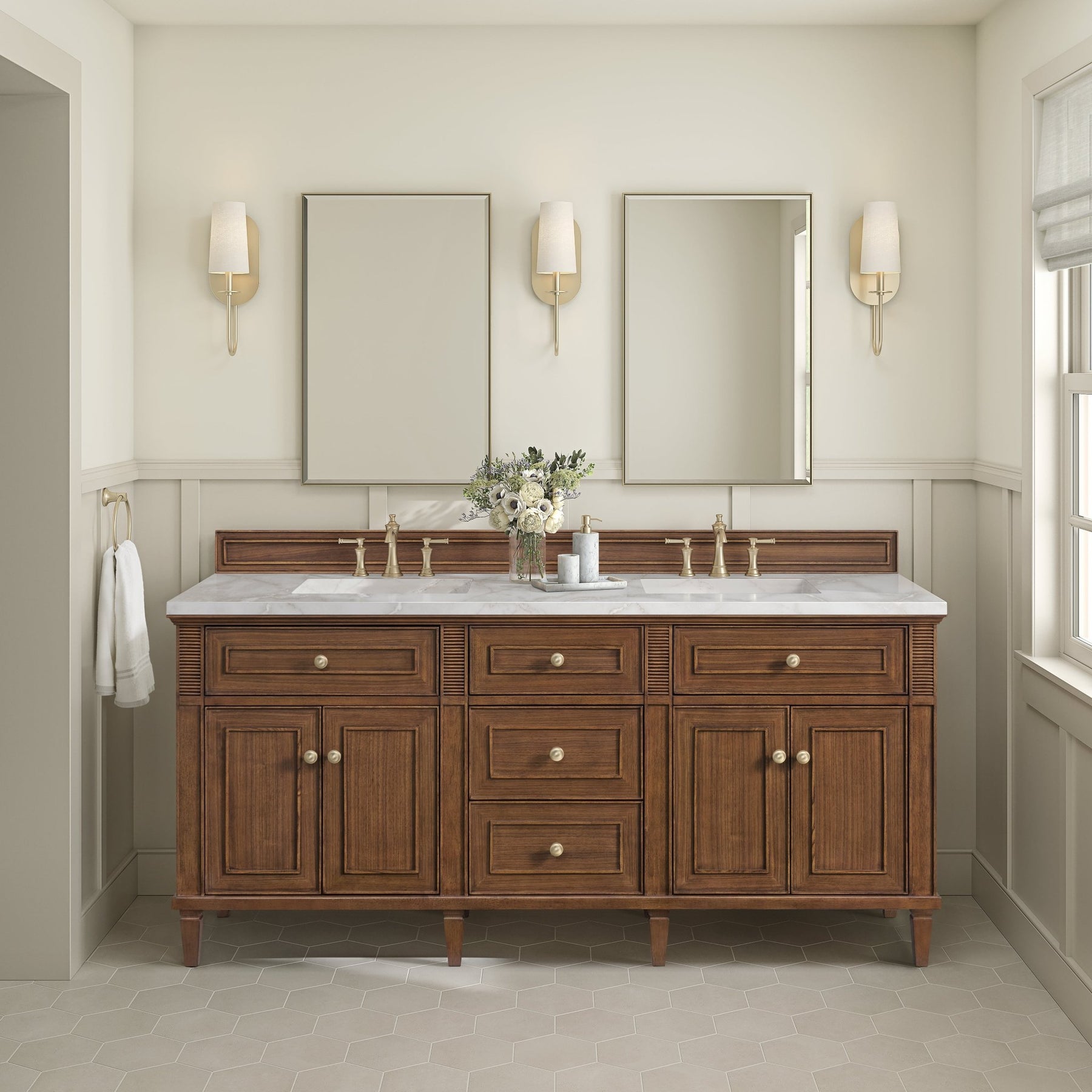 The 72” Lorelai Double Vanity celebrates timeless form and exquisite finish details, combined with practical function. The beauty of the natural grains in the walnut veneer is accented by reeded details, and clean, raised picture frame molding. The decorative, coin-edge knobs in Champagne Brass provide the perfect complement to the Mid-Century Walnut finish. This four-door cabinet opens to spacious interior with shelves and convenient USB/Electric power outlets. Three traditional drawers and two tip-outs offer additional storage space. With the addition of a classic White Zeus Silestone top and undermount sink, this vanity is a seamless integration of modern design and functionality.