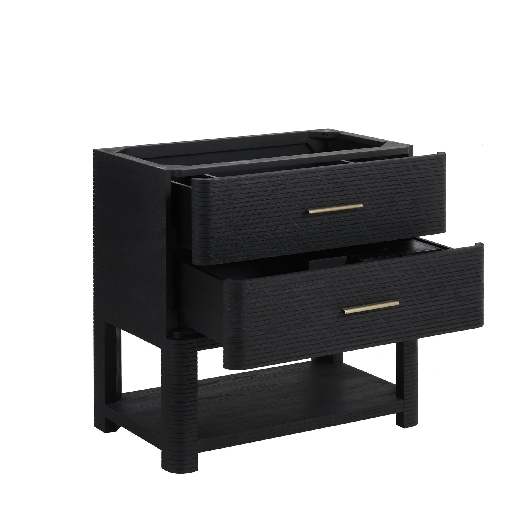 The Lucian 36” single vanity is a visual delight, boasting a rich Carbon Oak finish that adds warmth and character to your space. Complemented by Champagne Brass hardware, the ribbed detailing is meticulously crafted. Enjoy ample storage with two drawers and a lower exposed shelf that provides versatility to your storage solutions. Complete the look with one of our Silestone tops with undermount porcelain sink for a seamless integration of modern design and functionality.