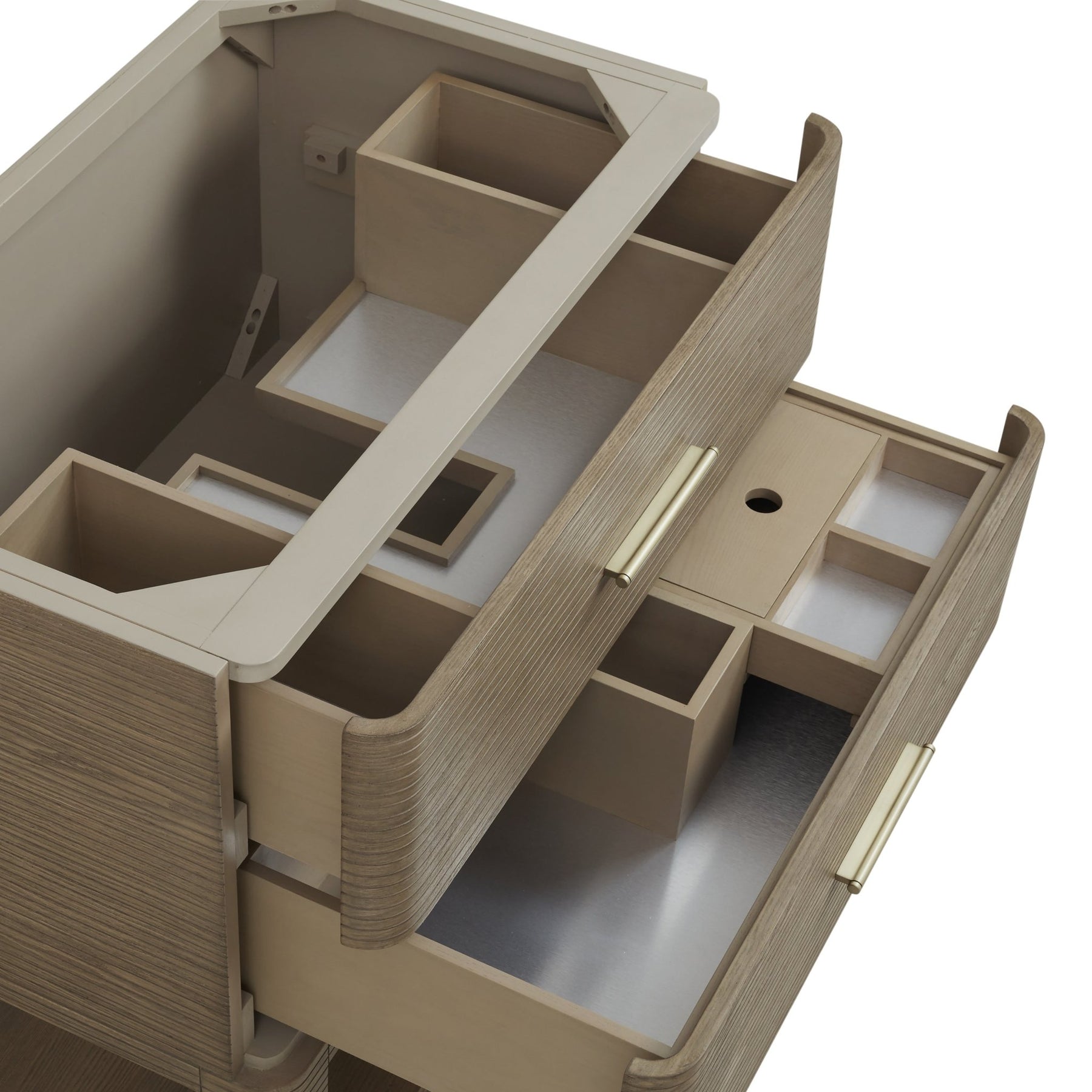 The Lucian 36” single vanity is a visual delight, boasting a rich Pebble Oak finish that adds warmth and character to your space. Complemented by Champagne Brass hardware, the ribbed detailing is meticulously crafted. Enjoy ample storage with two drawers and a lower exposed shelf that provides versatility to your storage solutions. Complete the look with one of our Silestone tops with undermount porcelain sink for a seamless integration of modern design and functionality.