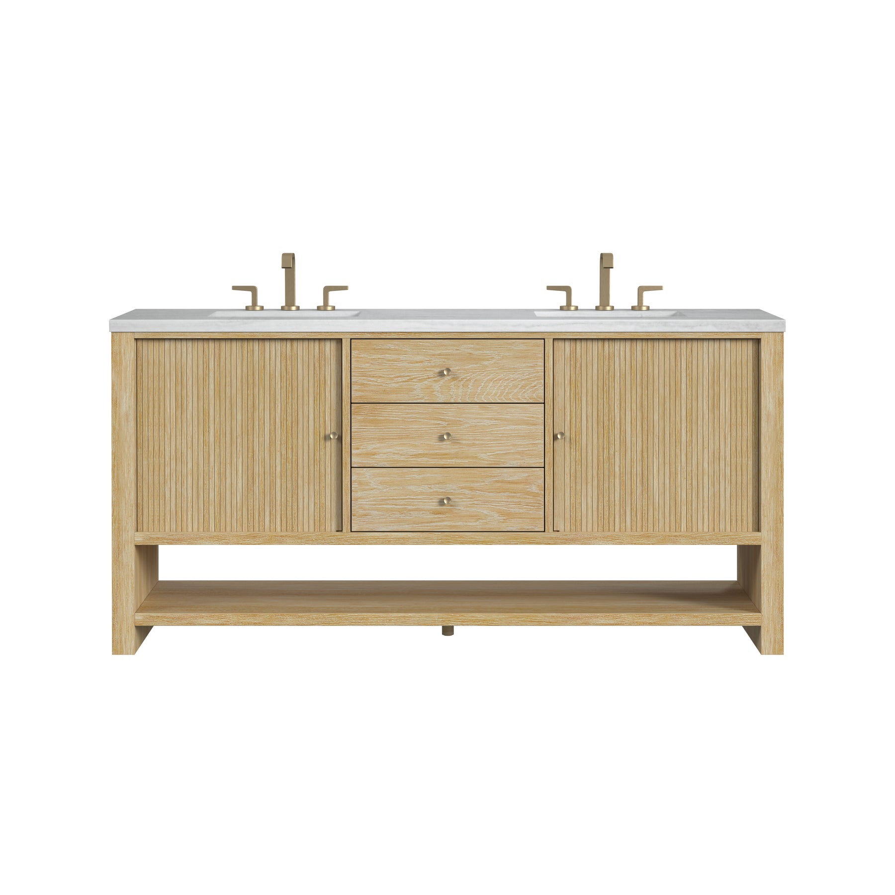 Crafted with precision, the understated waterfall frame of the Marigot 72” Double Vanity is adorned with tambour doors, adding a touch of elegance to its contemporary design. The cerused Sunwashed Oak finish creates a captivating warmth that is accentuated by Champagne Brass hardware. Three drawers and two tambour doors with an interior shelf and drawer provide ample storage while maintaining a sleek profile. The addition of two integrated power outlets makes this vanity incredibly functional. Completing this beautiful vanity is a 3cm solid surface Arctic Fall vanity top, which displays horizontal grey veining, giving you the look of classic marble with the benefits of modern technology.