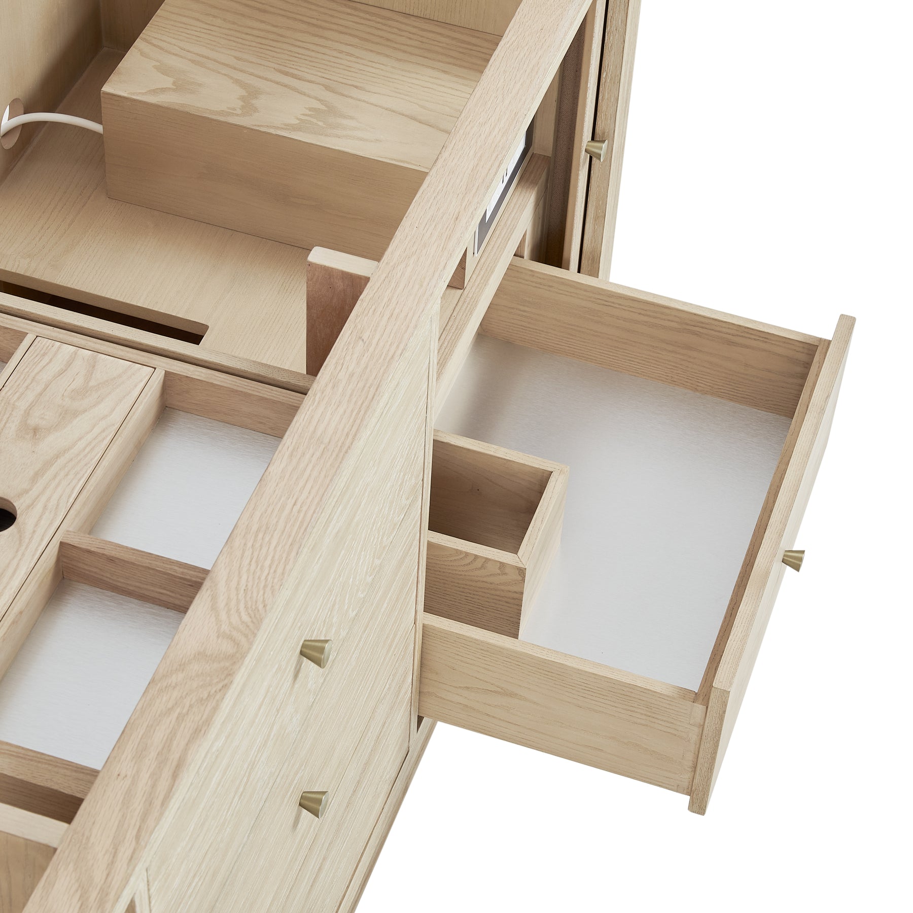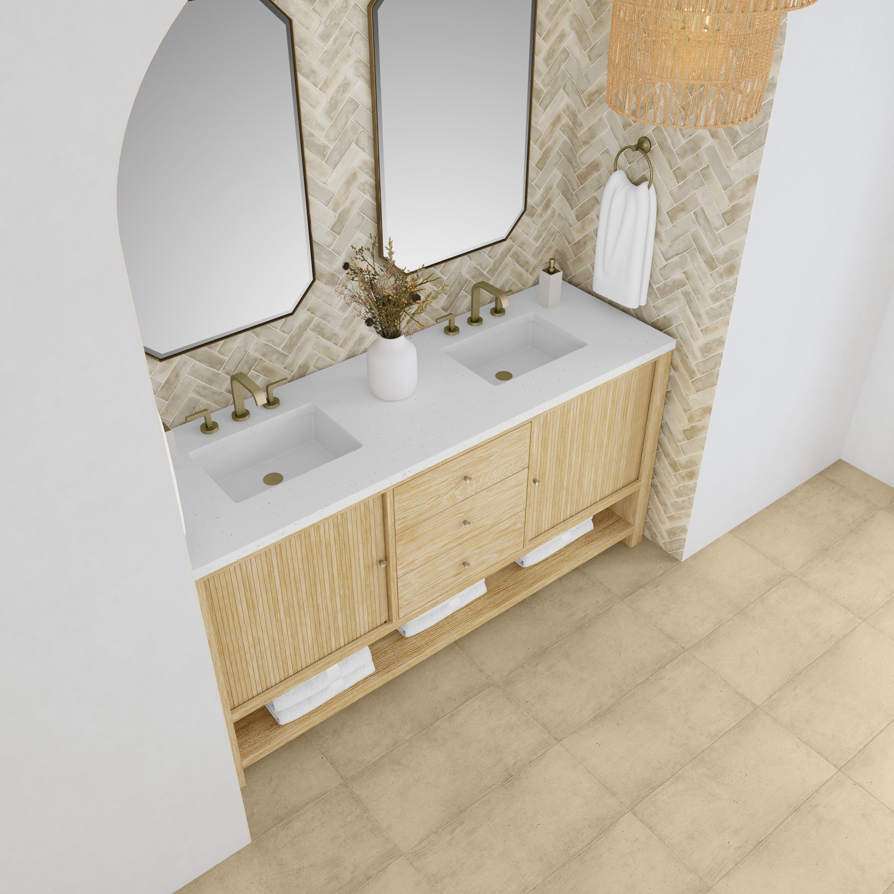 Crafted with precision, the understated waterfall frame of the Marigot 72” Double Vanity is adorned with tambour doors, adding a touch of elegance to its contemporary design. The cerused Sunwashed Oak finish creates a captivating warmth that is accentuated by Champagne Brass hardware. Three drawers and two tambour doors with an interior shelf and drawer provide ample storage while maintaining a sleek profile. The addition of two integrated power outlets makes this vanity incredibly functional. The Lime Delight Silestone top lends warm, textured beige tones to perfectly complement the warm, Sunwashed Oak finish on the vanity.