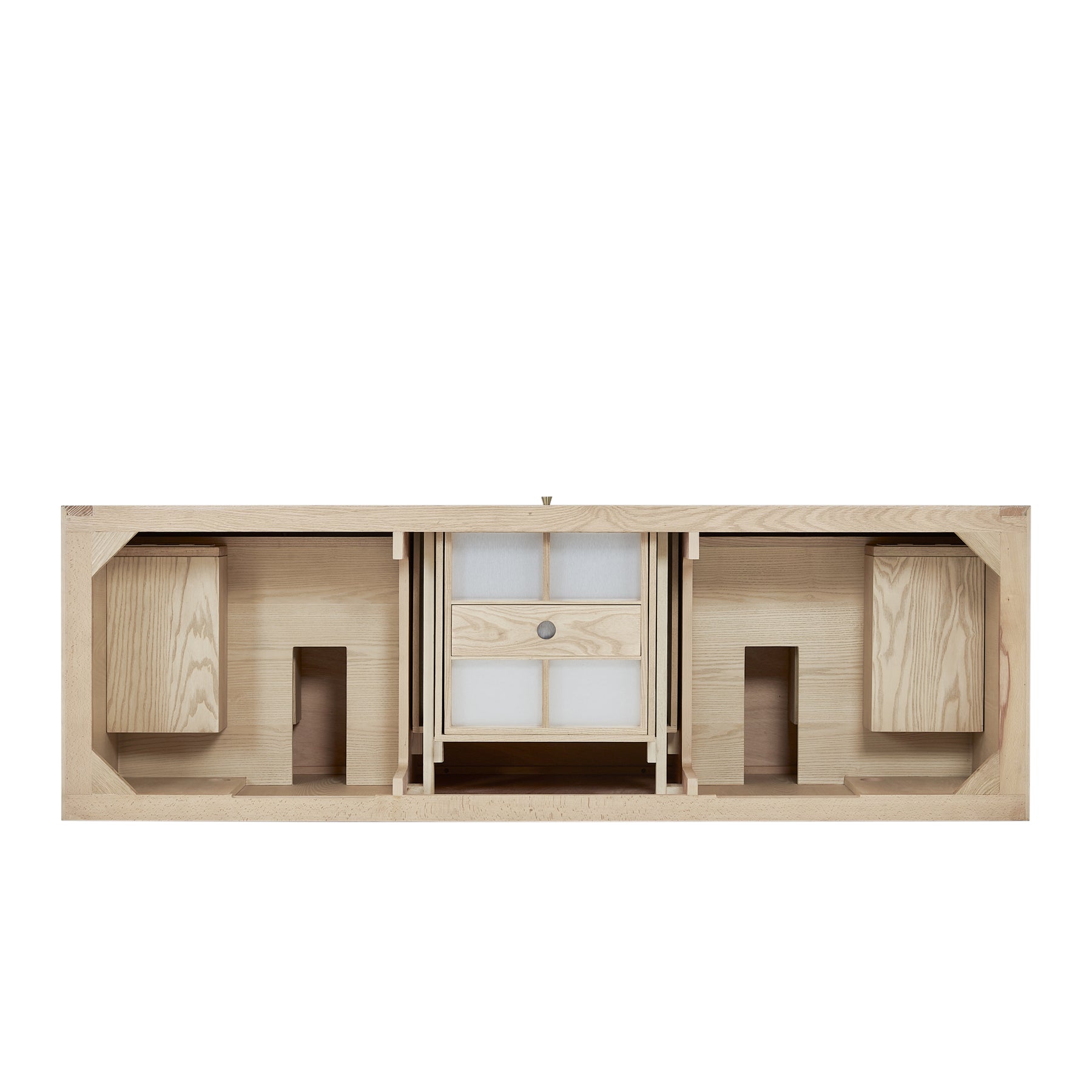 Crafted with precision, the understated waterfall frame of the Marigot 72” Double Vanity is adorned with tambour doors, adding a touch of elegance to its contemporary design. The cerused Sunwashed Oak finish creates a captivating warmth that is accentuated by Champagne Brass hardware. Three drawers and two tambour doors with an interior shelf and drawer provide ample storage while maintaining a sleek profile. The addition of two integrated power outlets makes this vanity incredibly functional. A pristine White Zeus Silestone by Cosentino top and backsplash with two undermount rectangular sinks complete this striking piece.