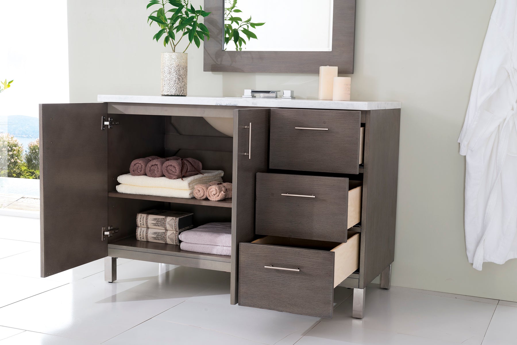 The Metropolitan 48" Silver Oak Single Vanity by James Martin Vanities is a wall-mount optional cabinet with mounting brackets and removable Brushed Nickel legs. This cabinet offers ample storage space and soft-close doors and drawers. The look is completed with a 3 CM eased edge Arctic Fall Solid Surface top and one white ceramic rectangular sink.
