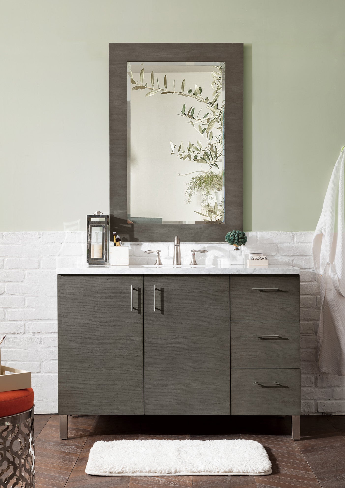 The Metropolitan 48" Silver Oak Single Vanity by James Martin Vanities is a wall-mount optional cabinet with mounting brackets and removable Brushed Nickel legs. This cabinet offers ample storage space and soft-close doors and drawers. The look is completed with a 3 CM eased edge Carrara Marble top and one white ceramic rectangular sink.