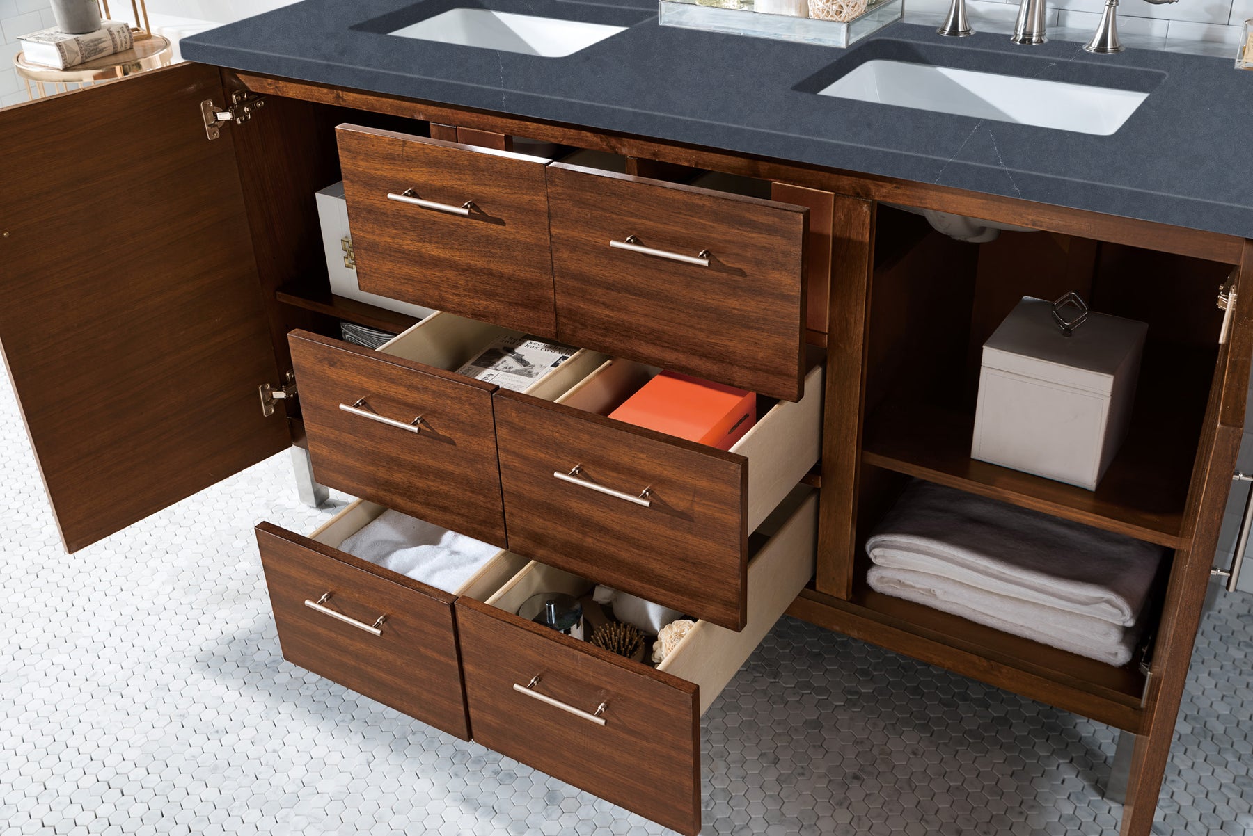 The Metropolitan 60" American Walnut Double Vanity by James Martin Vanities is a wall-mount optional cabinet with mounting brackets and removable Brushed Nickel legs. This cabinet offers ample storage space and soft-close doors and drawers. The look is completed with a 3 CM eased edge Charcoal Soapstone Silestone top and one white ceramic rectangular sink.